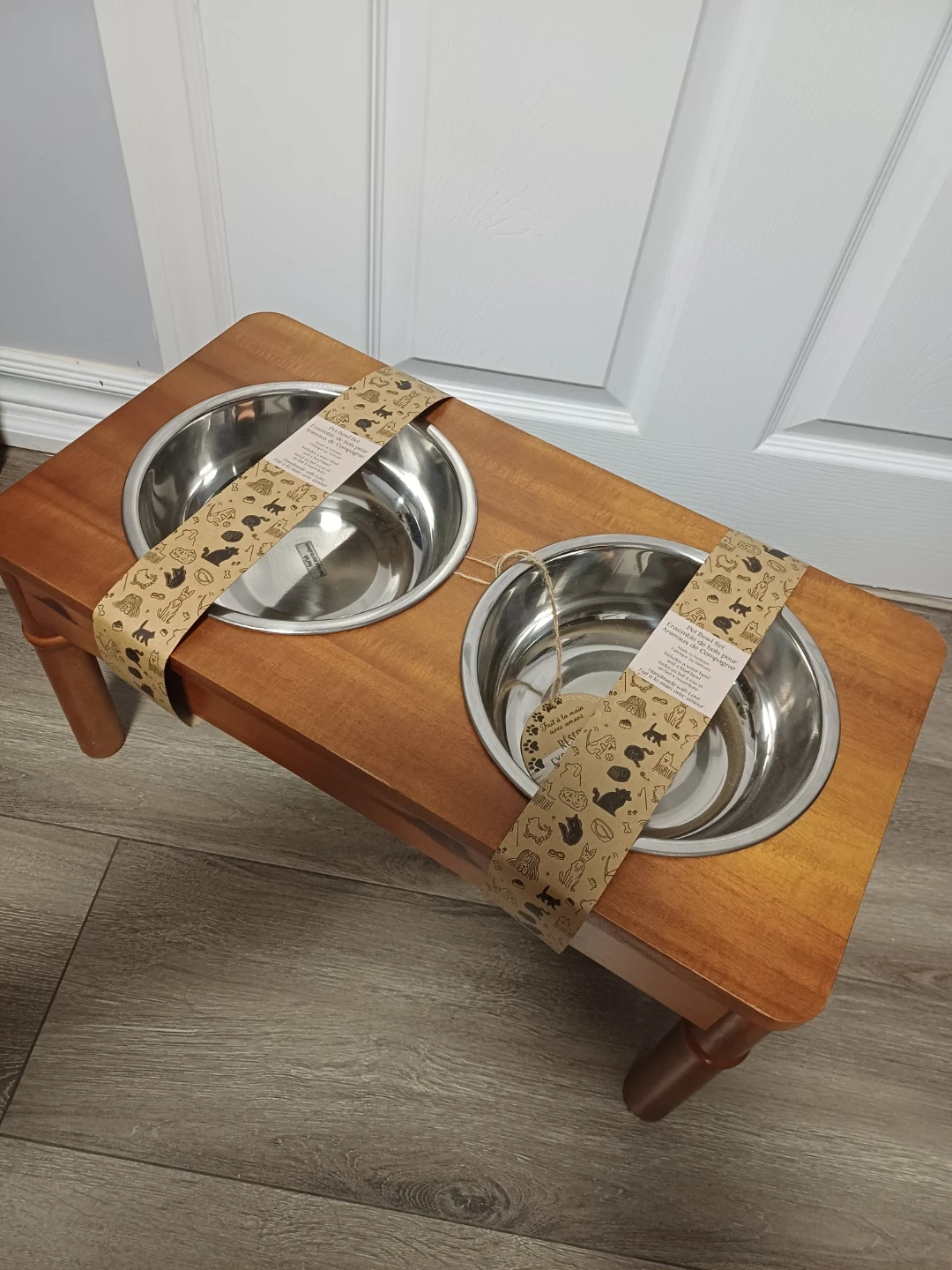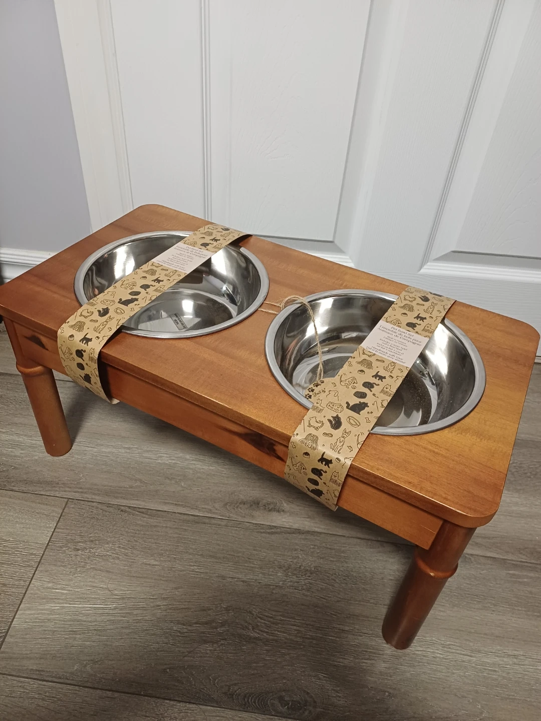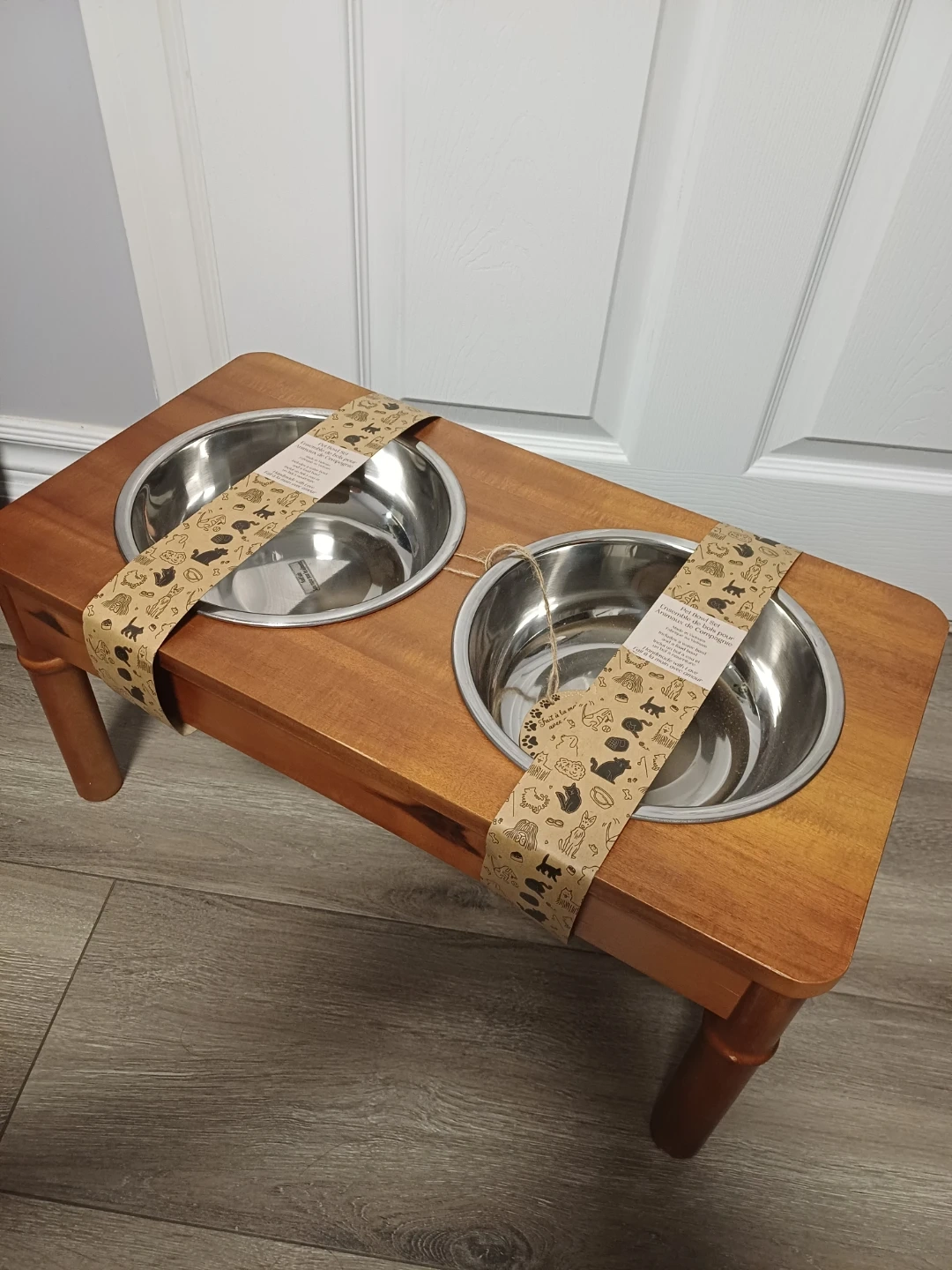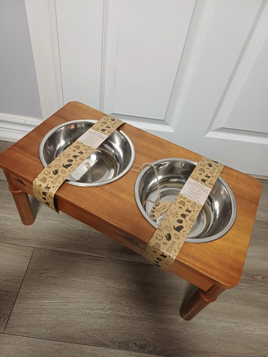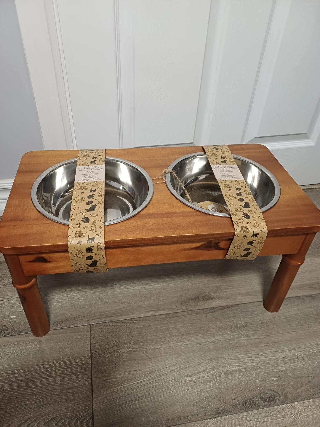 Wood stand keeps bowls stable. Easy for pets to access food and water.