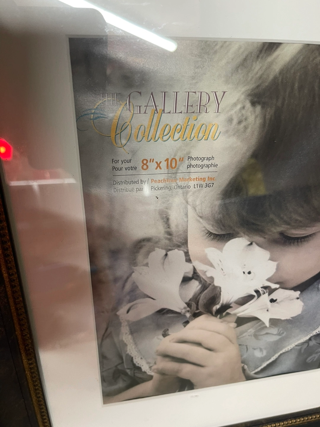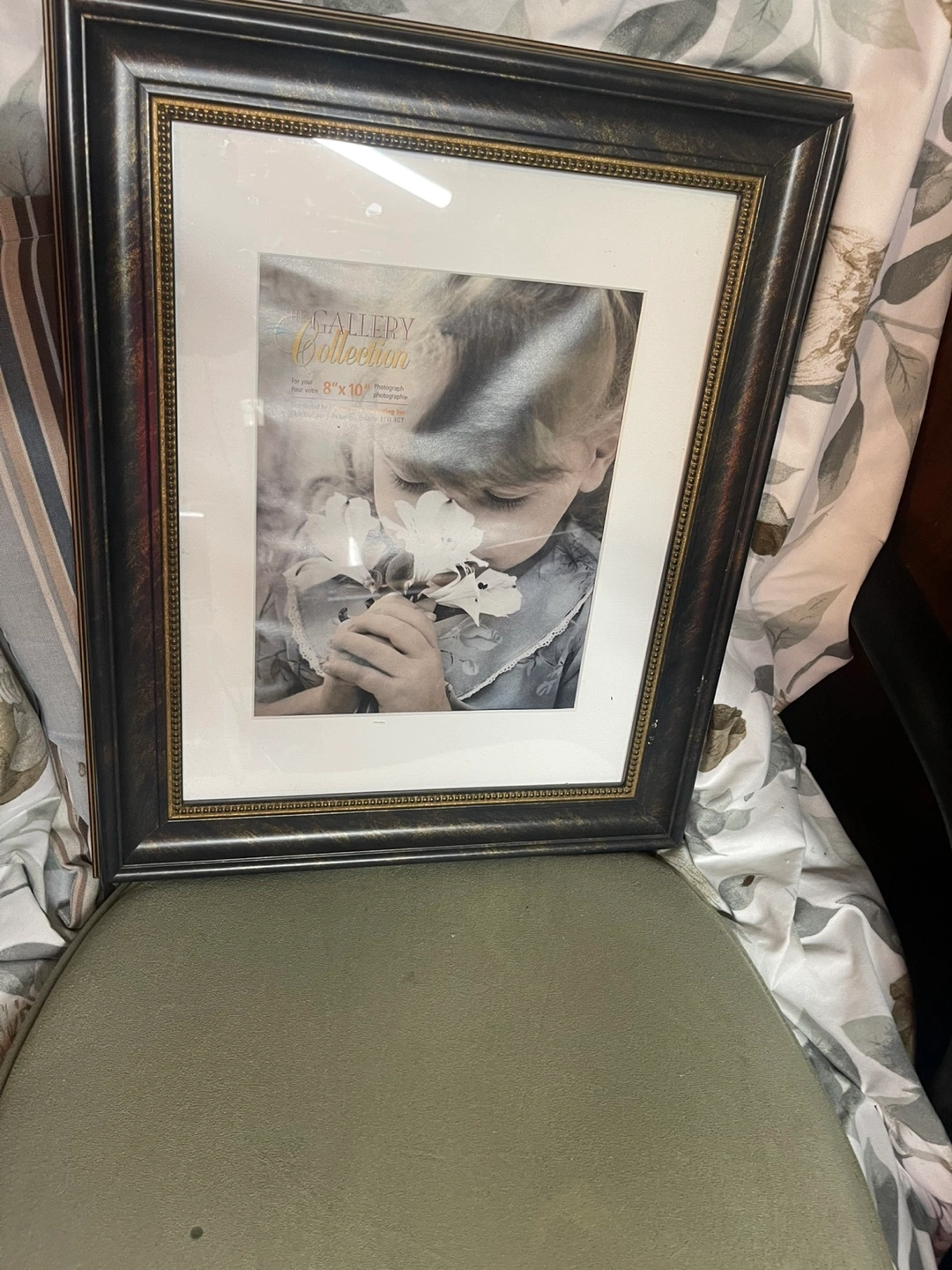 Dark brown wood frame. Gold detailing. Fits an 8x10 photograph. Includes matting.
