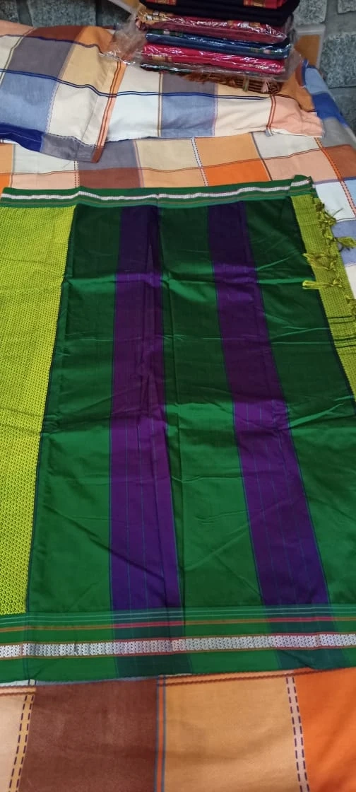 Traditional woven khun saree in a vibrant green hue. Features a textured pattern and decorative striped border with tassels. It's made from woven fabric. Suitable for cultural events or daily wear.