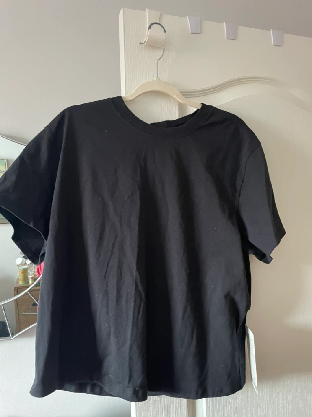 This is a Lululemon Relaxed-Fit Cotton Jersey T-Shirt in black. It's made from 100% cotton jersey fabric. The shirt features a relaxed fit and hip length. It's designed for comfort and breathability.