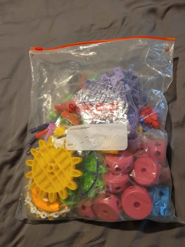 Colorful mix of SuperStructs and Quercetti building blocks. Has lots of different shapes and colors, including gears, rods, and connectors. Great for creative play!