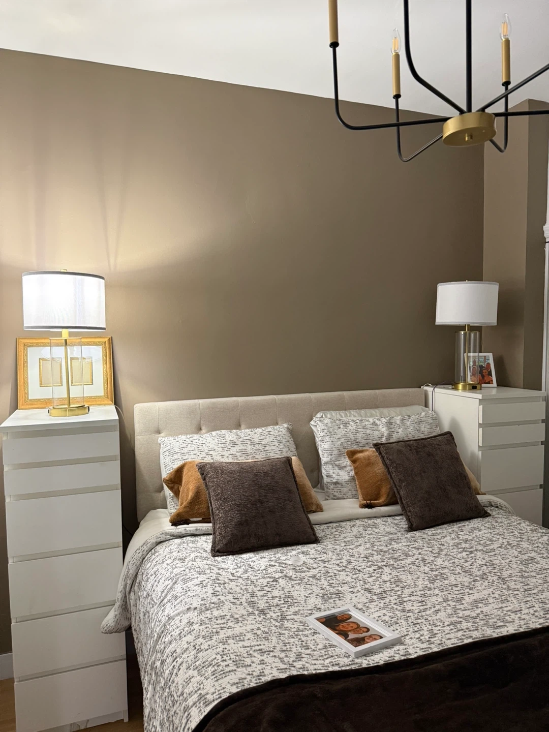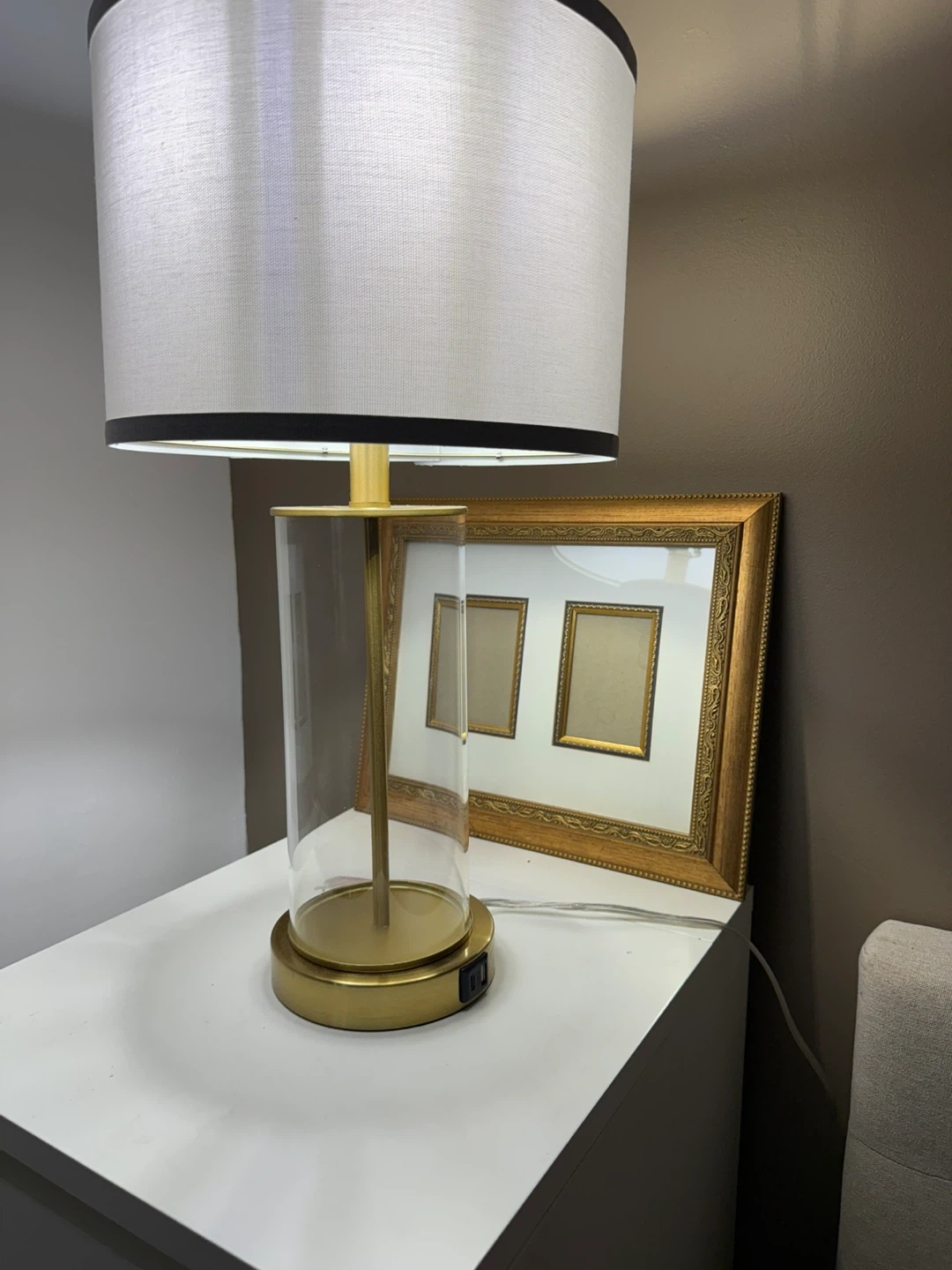 This table lamp features a clear glass cylinder base with gold accents. It has a white fabric shade. The lamp includes an inline power switch on the cord. Perfect for a nightstand or side table! 2 pcs