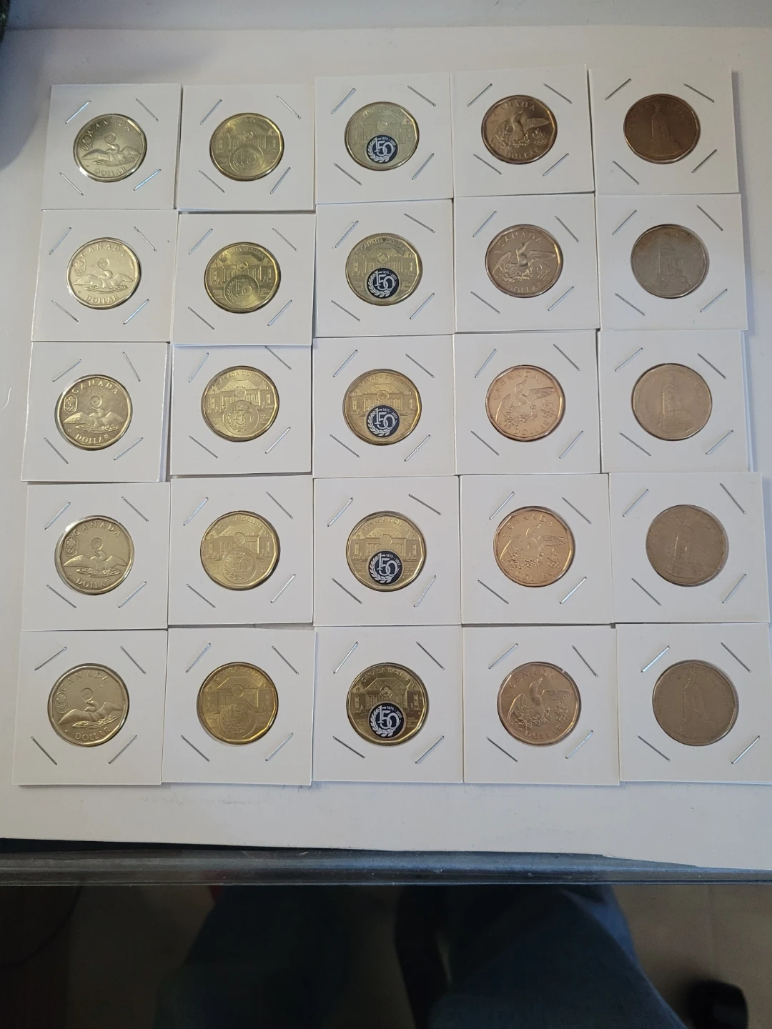 This is a collection of various Canadian coins. It includes dollars with loons and some coins featuring a "50" anniversary design. The coins are presented in individual protective sleeves.