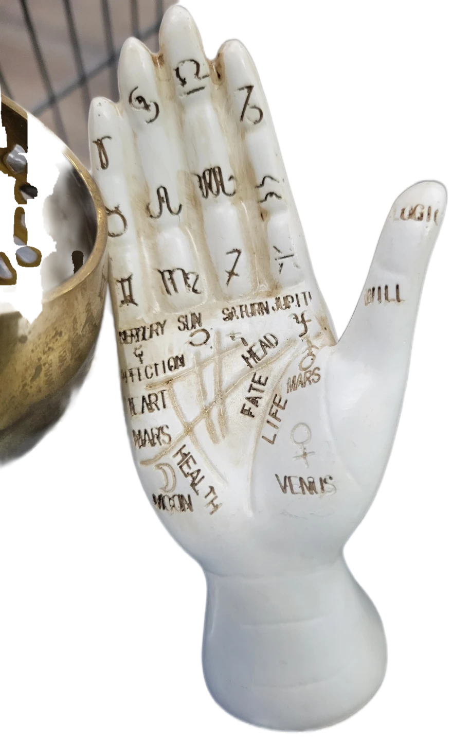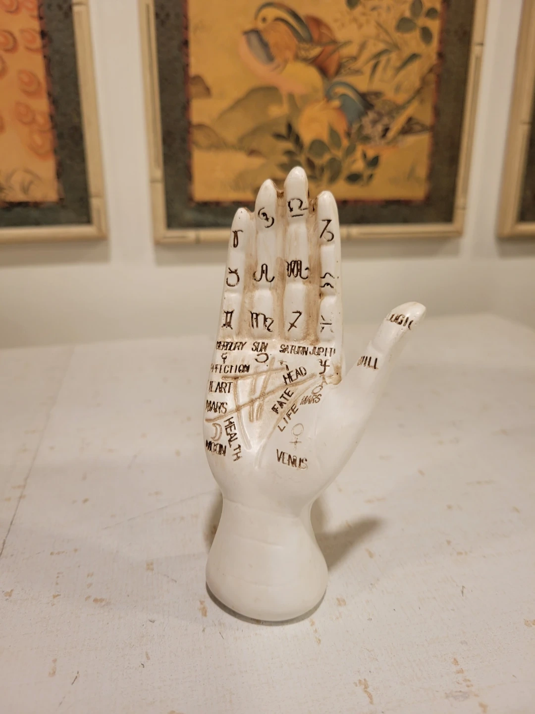 Explore the mystical arts with this vintage palmistry hand, a unique decorative piece showcasing the ancient practice of palm reading. The hand features detailed markings and symbols associated with palmistry. It is in used condition, showing some signs of age that add to its vintage charm.