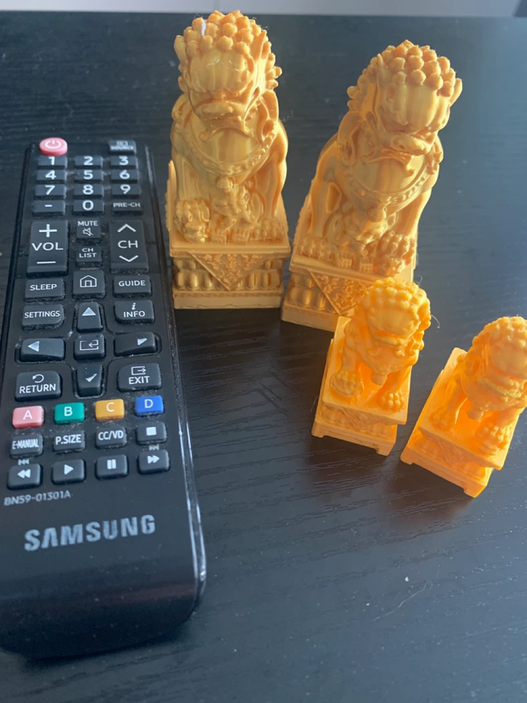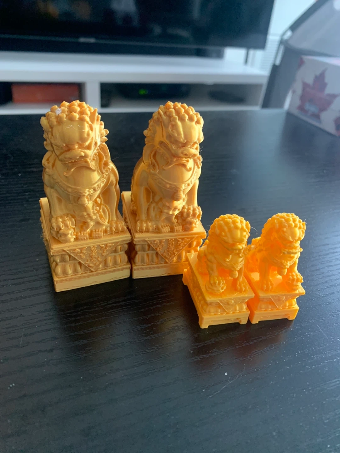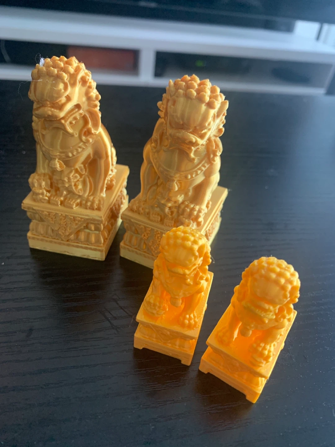 This is a set of four orange-coloured figurines, resembling Foo Dogs or guardian lions. The set includes two larger pieces and two smaller pieces, perfect for accentuating decor. The material appears to be plastic or resin, likely 3D printed.