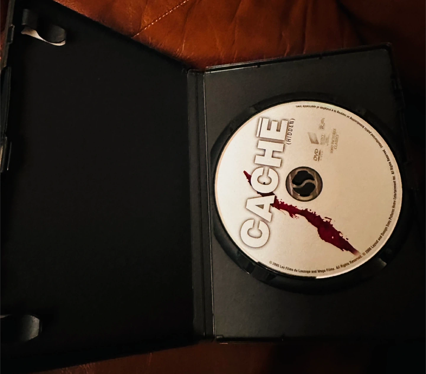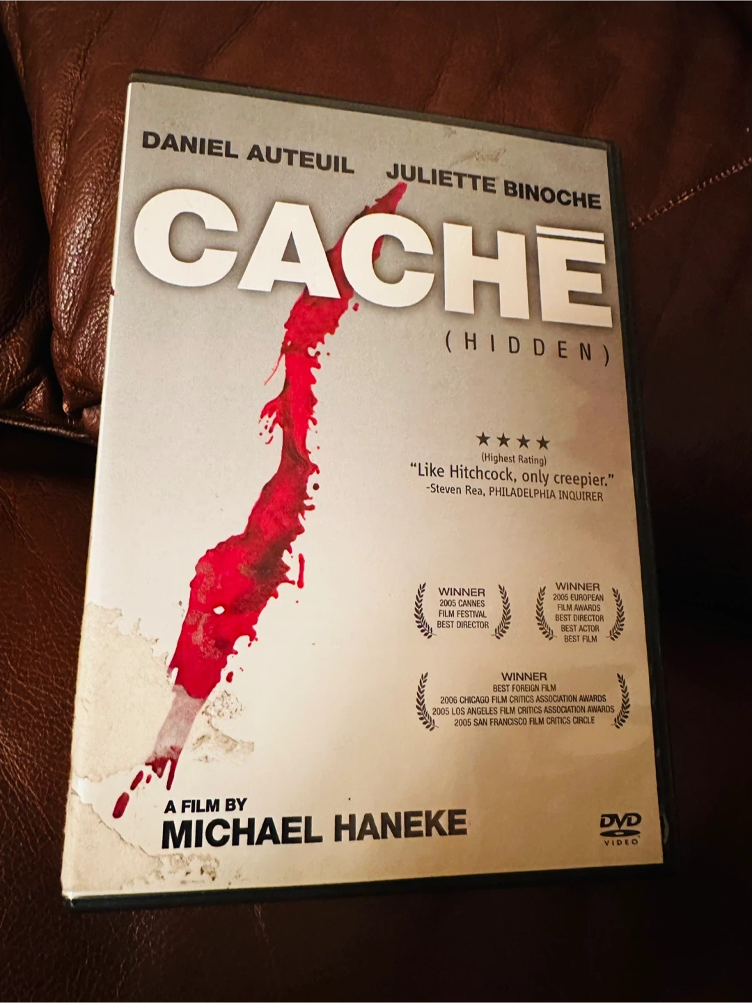 This is the DVD for the film Cache (Hidden), directed by Michael Haneke. It features Daniel Auteuil and Juliette Binoche. The DVD includes English 5.0 Dolby Digital audio and is rated R for brief strong violence.