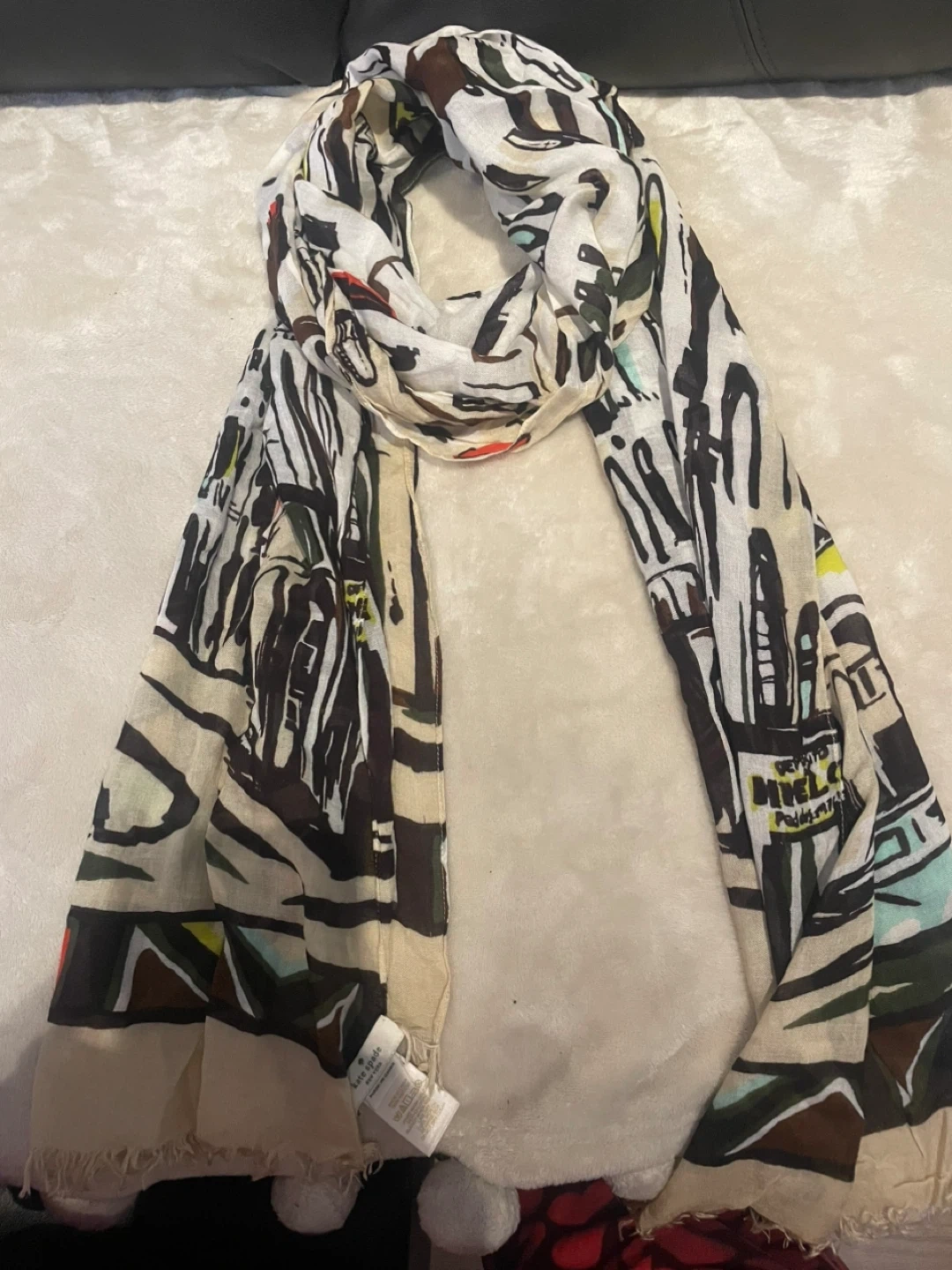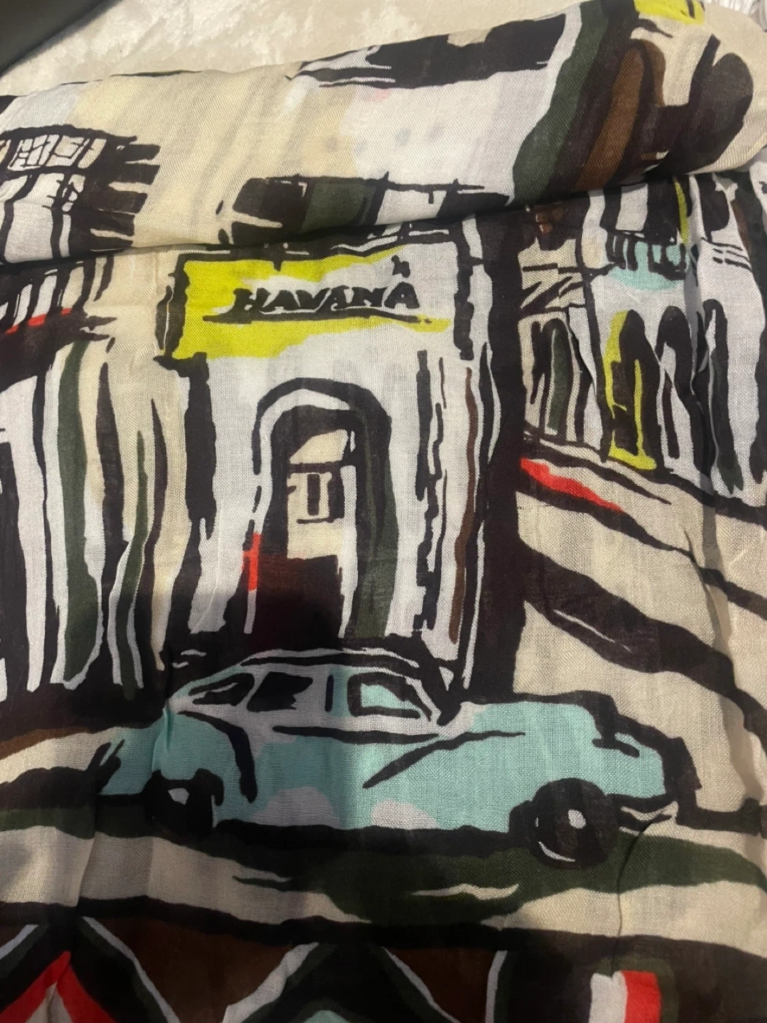 This is a Kate Spade New York scarf featuring a Havana street scene with a vintage car. It's made of 100% viscose. Hand wash cold, bleach when needed, cool iron on reverse, do not dry clean.