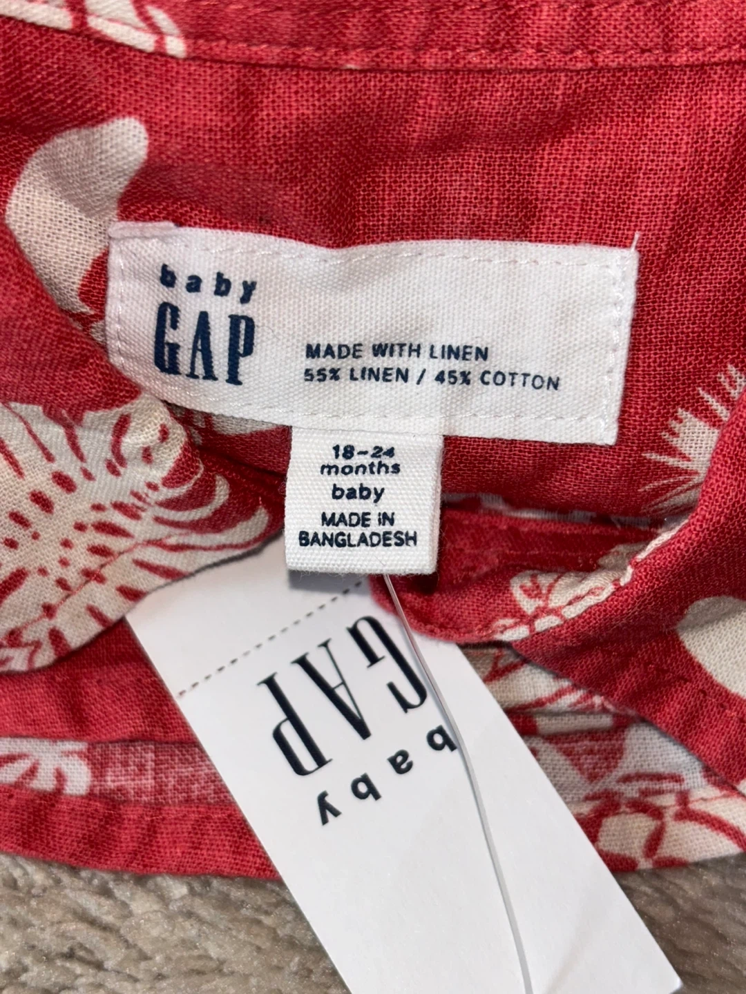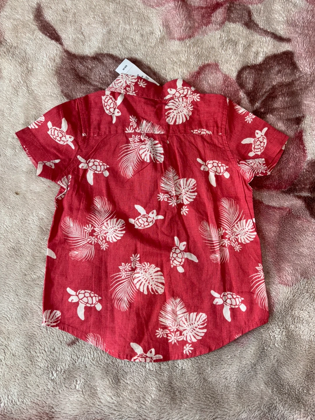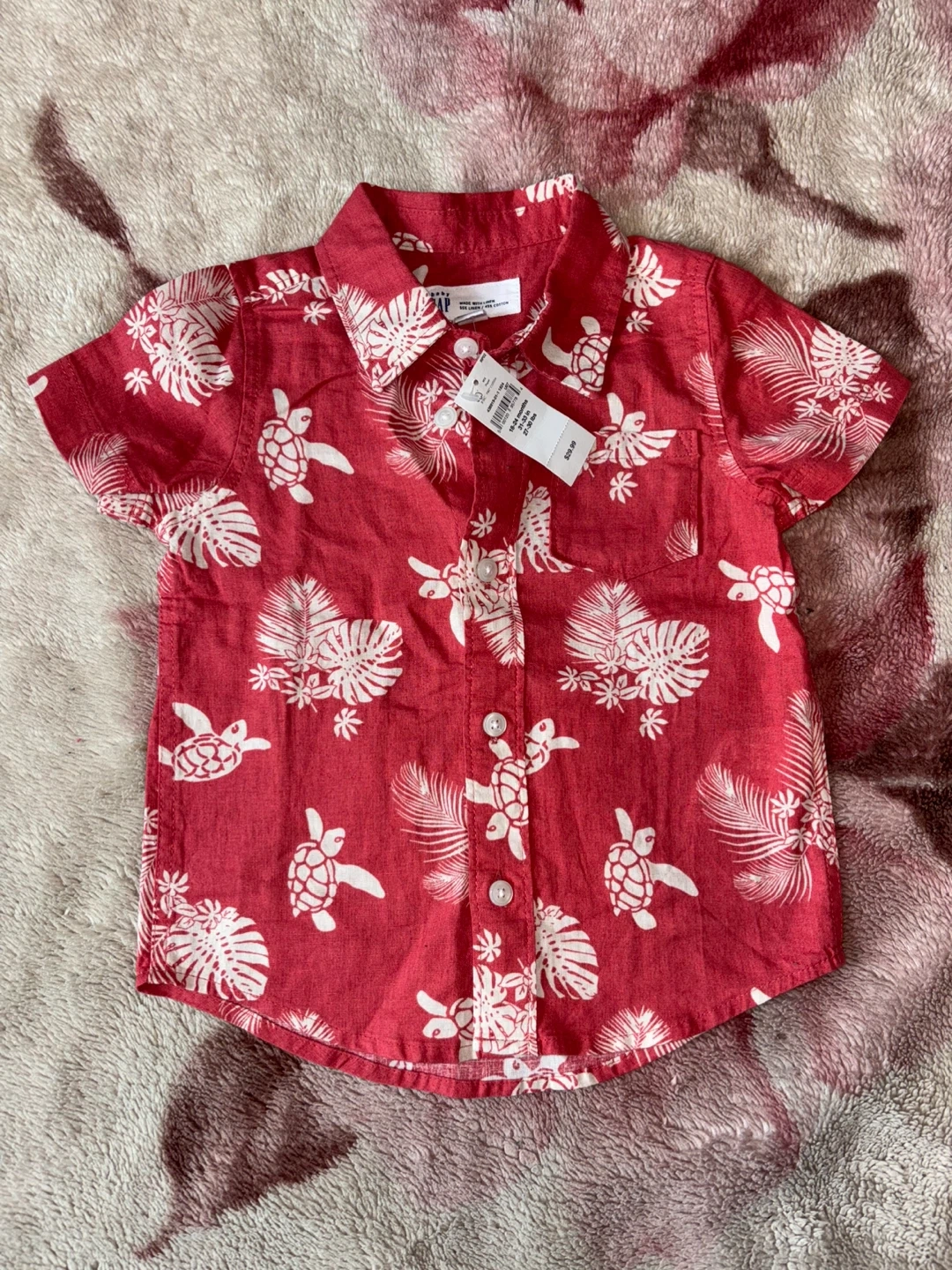 Baby Gap short-sleeve collared shirt. Made with 55% linen and 45% cotton. Features a red background with a white tropical leaf and turtle print. Size is 18-24 months.
