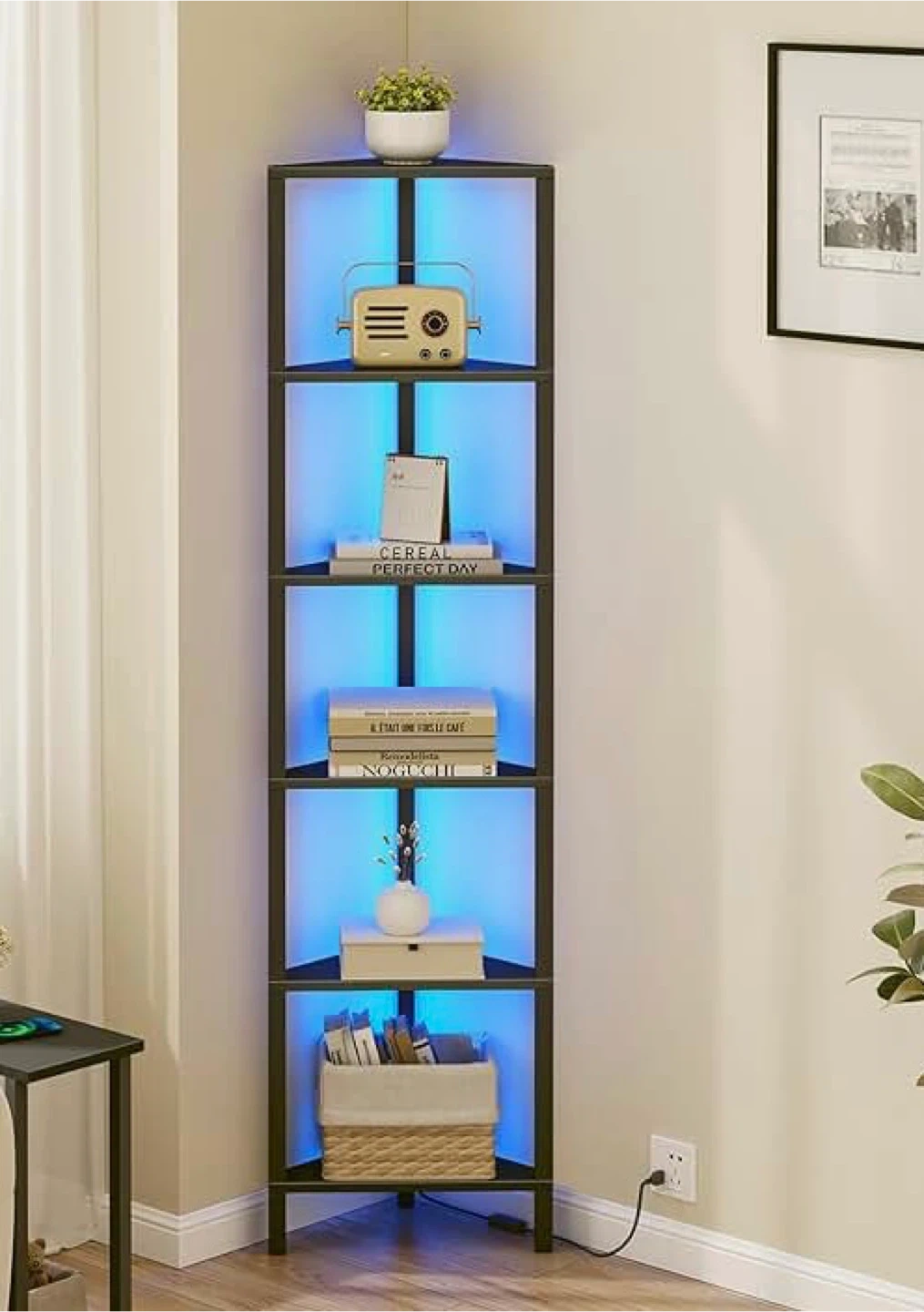 This five-tier corner shelf unit comes with built-in LED lighting for a stylish display. It's a great space-saving solution for any room. Constructed from durable metal, its modern design fits various decor styles.