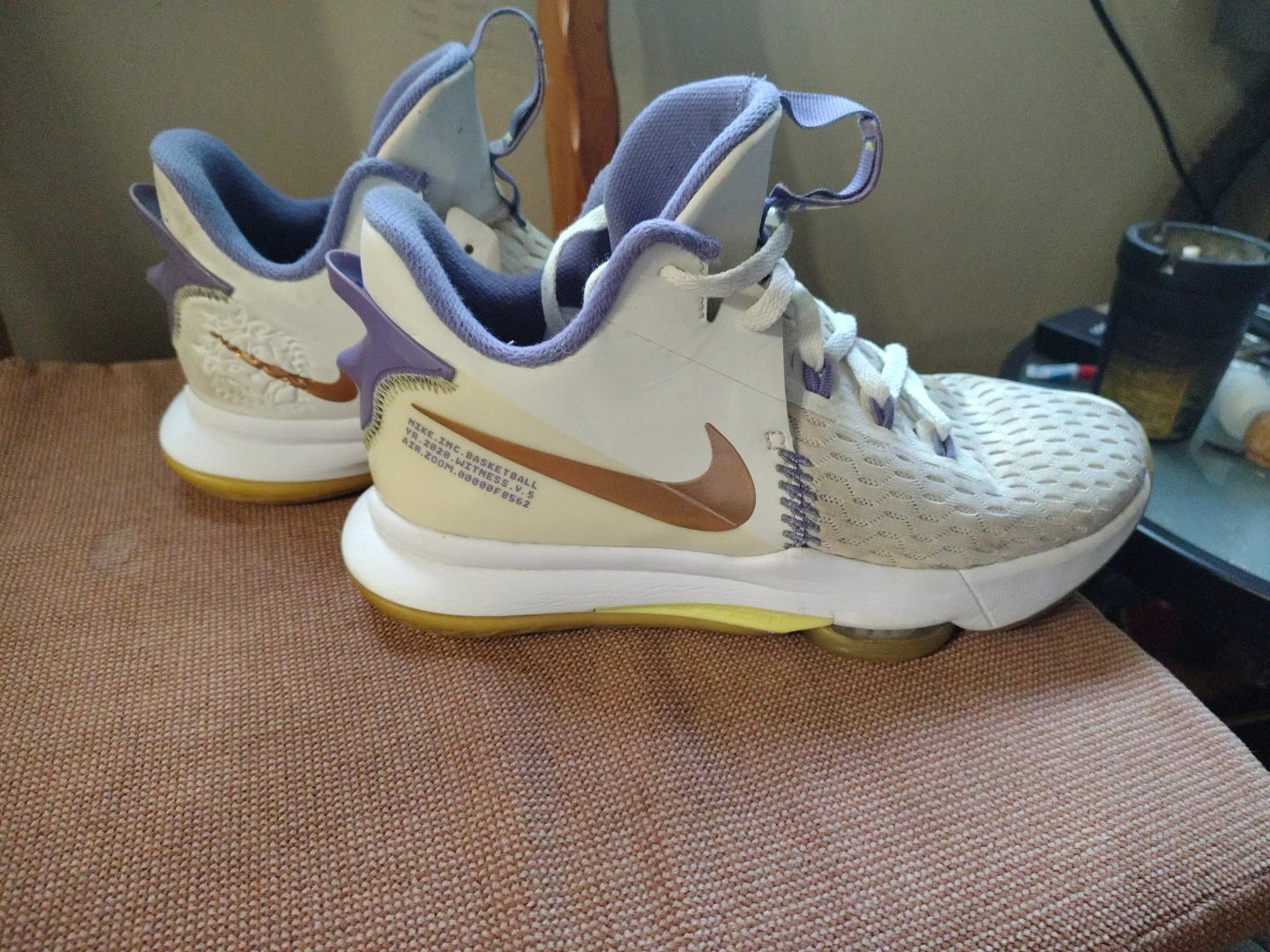 Nike Air Zoom basketball shoes, model Witness 5. It's a white, purple, and gold colourway. These shoes are designed for basketball performance.
