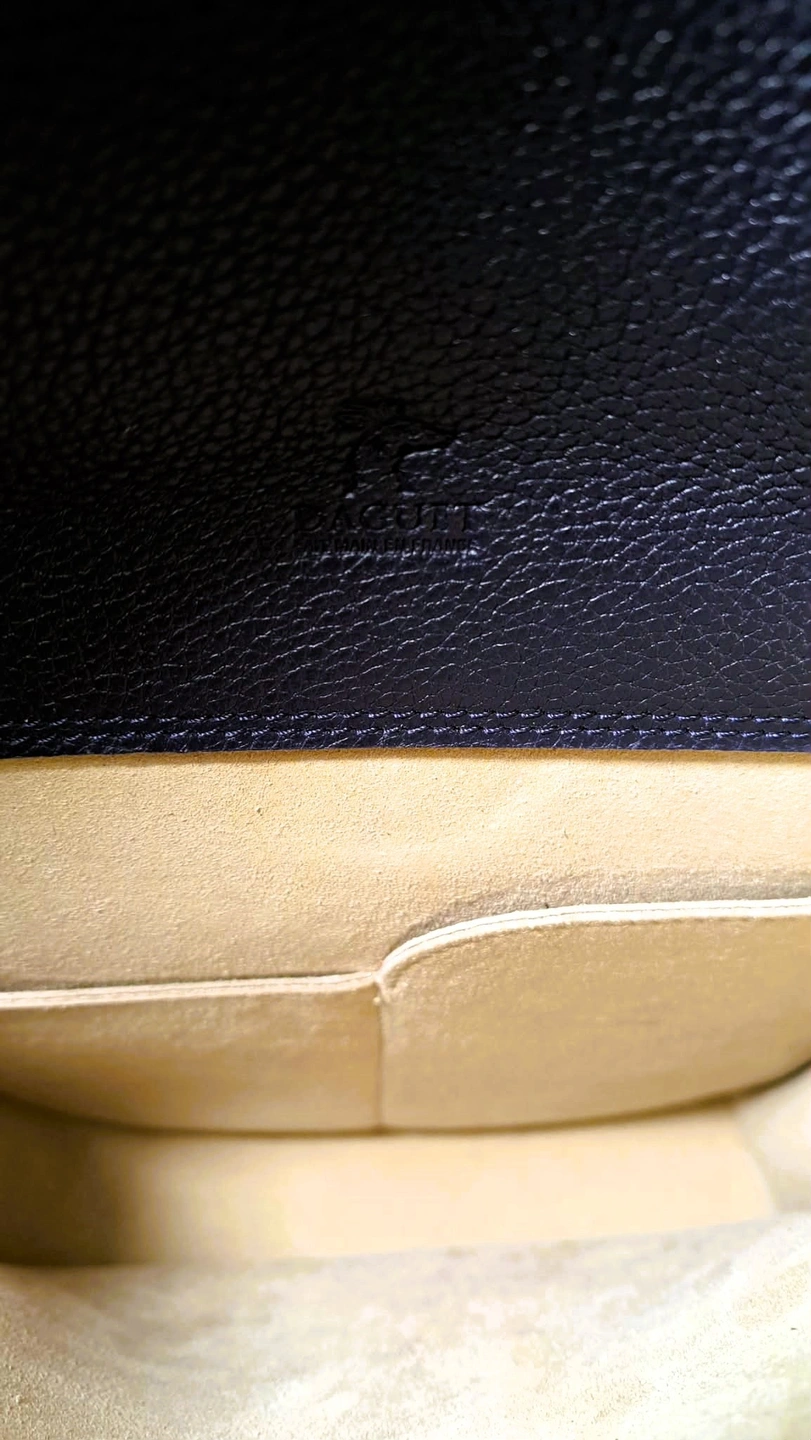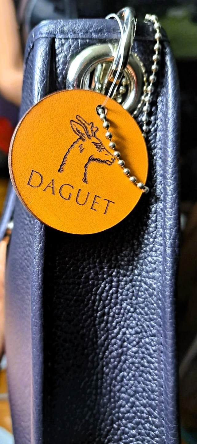 Design Details: Features a secure flap closure with a single snap button and eye-catching silver-tone hardware. The iconic round tan leather charm with the Daguet logo in a signature accessory featuring the brand's logo (a young deer or brocket) is attached for an authentic touch. The interior has a pebbled leather flap featuring an embossed young deer signature logo and 2 pockets. The creamy beige interior is made of suede or a soft leather lining.