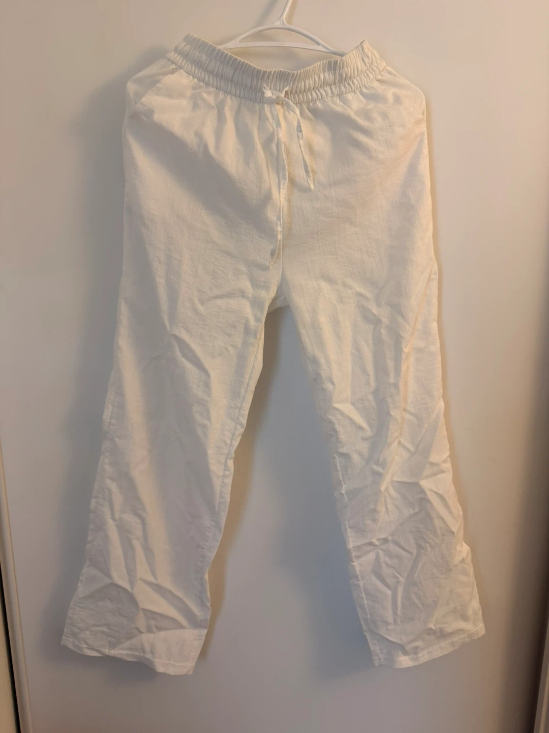Comfy white linen pants with an elastic waistband and drawstring. They're perfect for lounging around or casual wear. Made of a breathable linen blend.