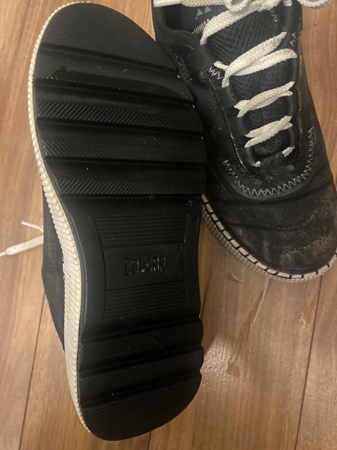 Black Cougar waterproof sneakers for women. These shoes feature a thick platform sole and white laces. They're ready for any weather! Size 6