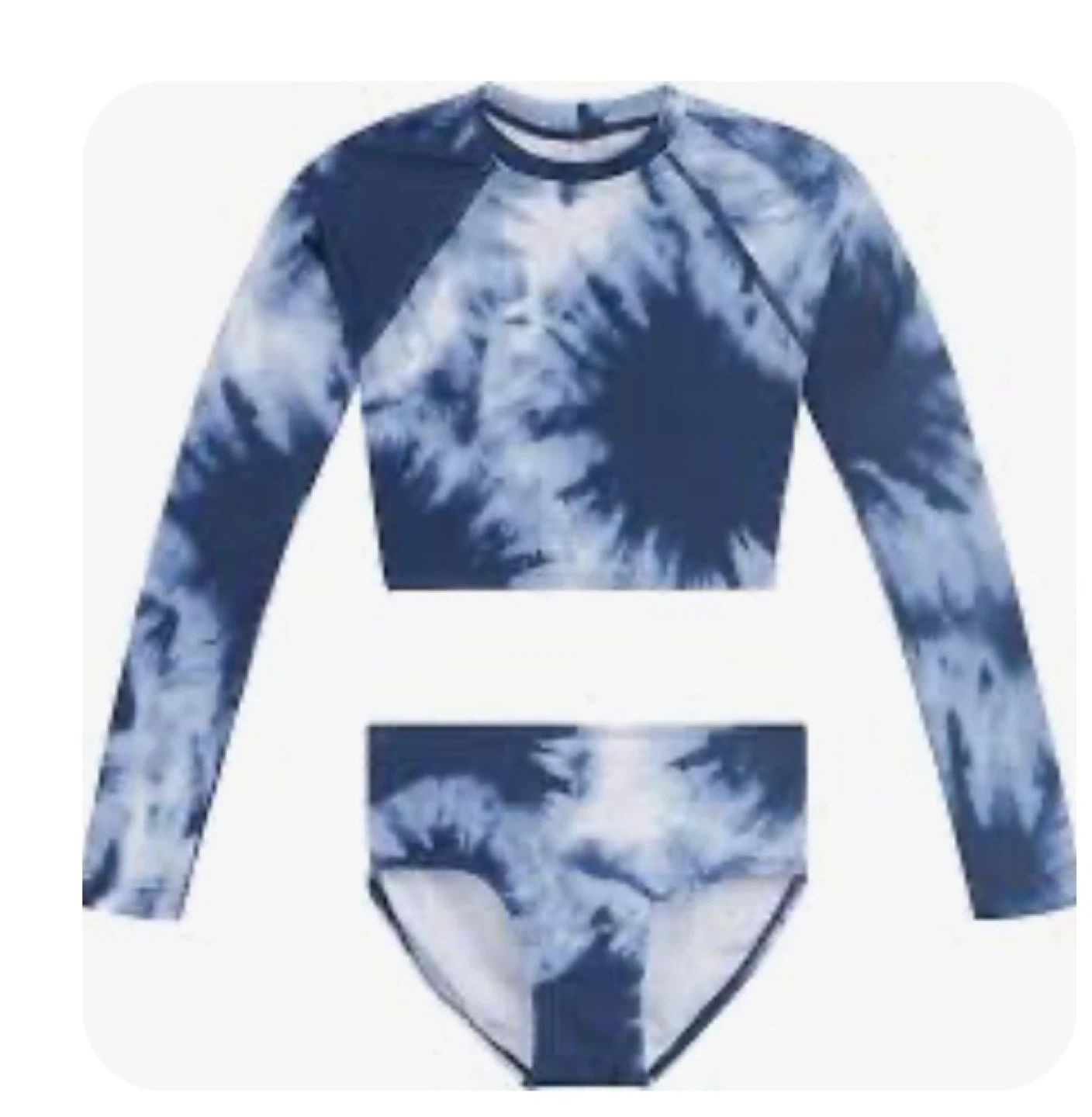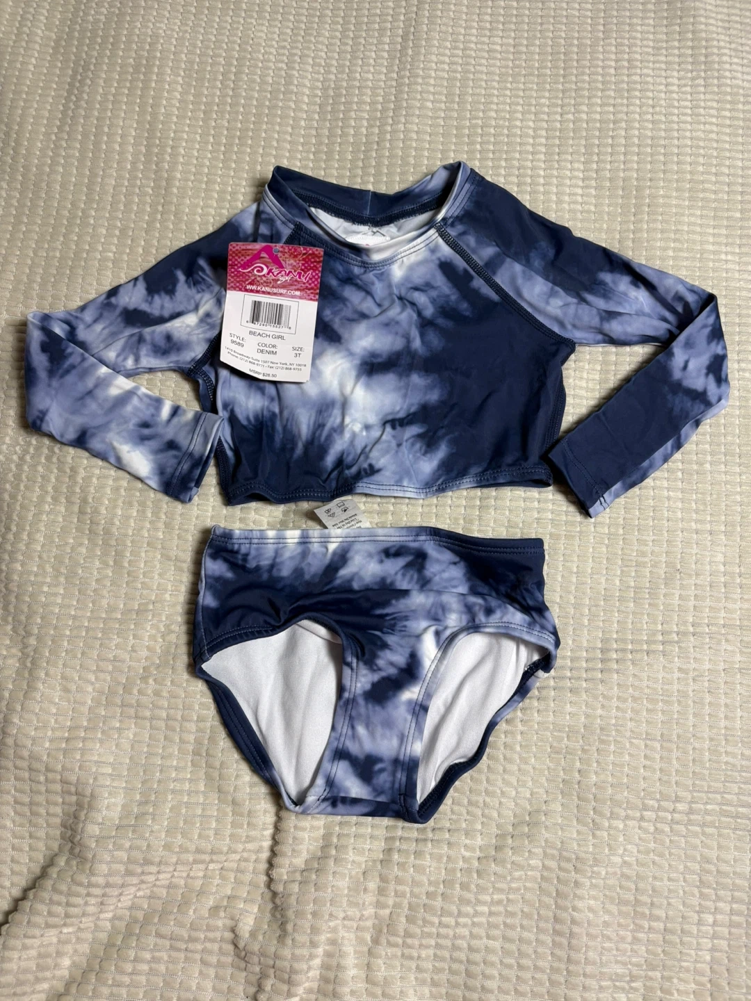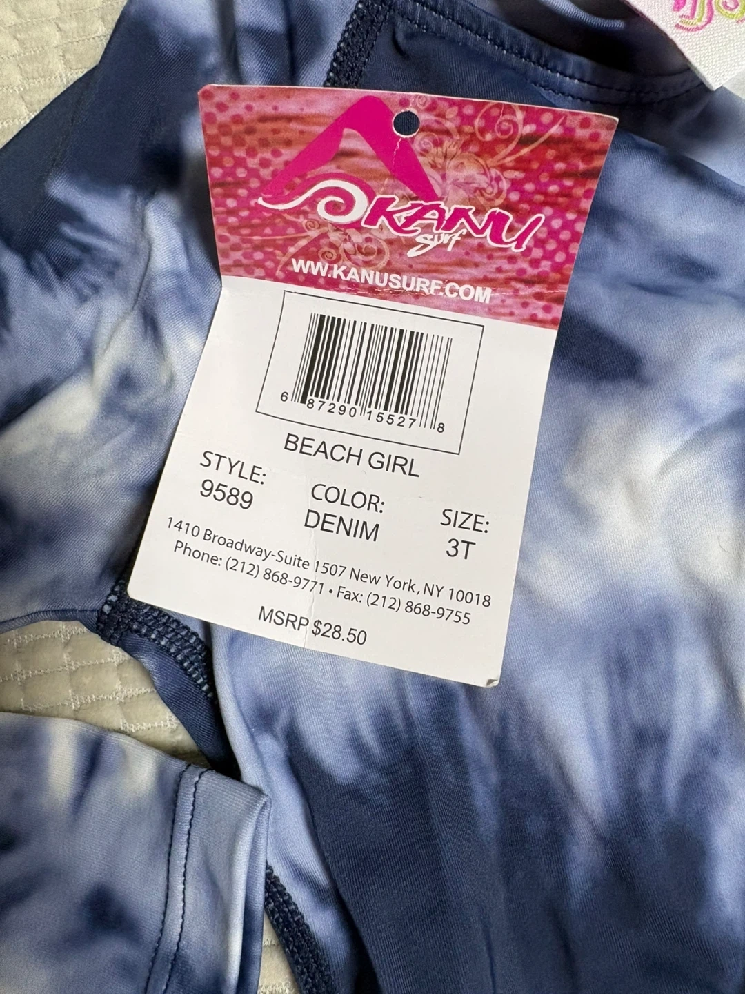 This Kanu Surf "Beach Girl" rashguard swimsuit set features a tie-dye pattern in denim blue and white. It's made of 82% Nylon and 18% Spandex with a 100% Polyester liner. This set is perfect for a day at the beach or pool!