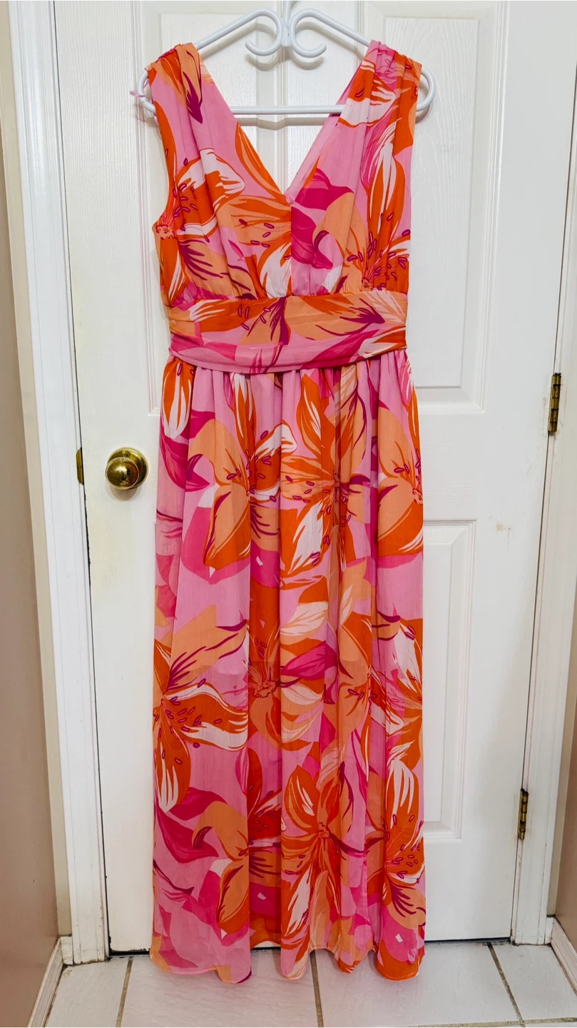 A vibrant floral maxi dress featuring a V-neckline and a cinched waist. It's made of a lightweight, flowy fabric perfect for warmer weather. This dress is great for casual outings or a summer event!