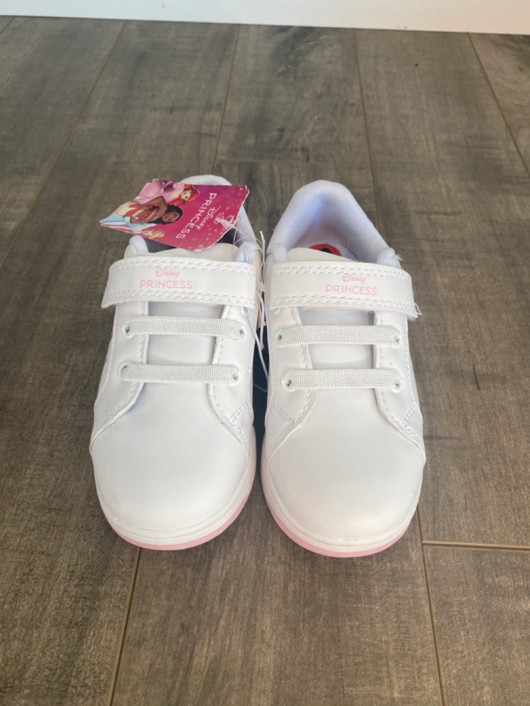 Cute white Disney Princess sneakers with hook-and-loop straps for easy on and off. Features several princesses printed along the sides. Rubber soles are pink.