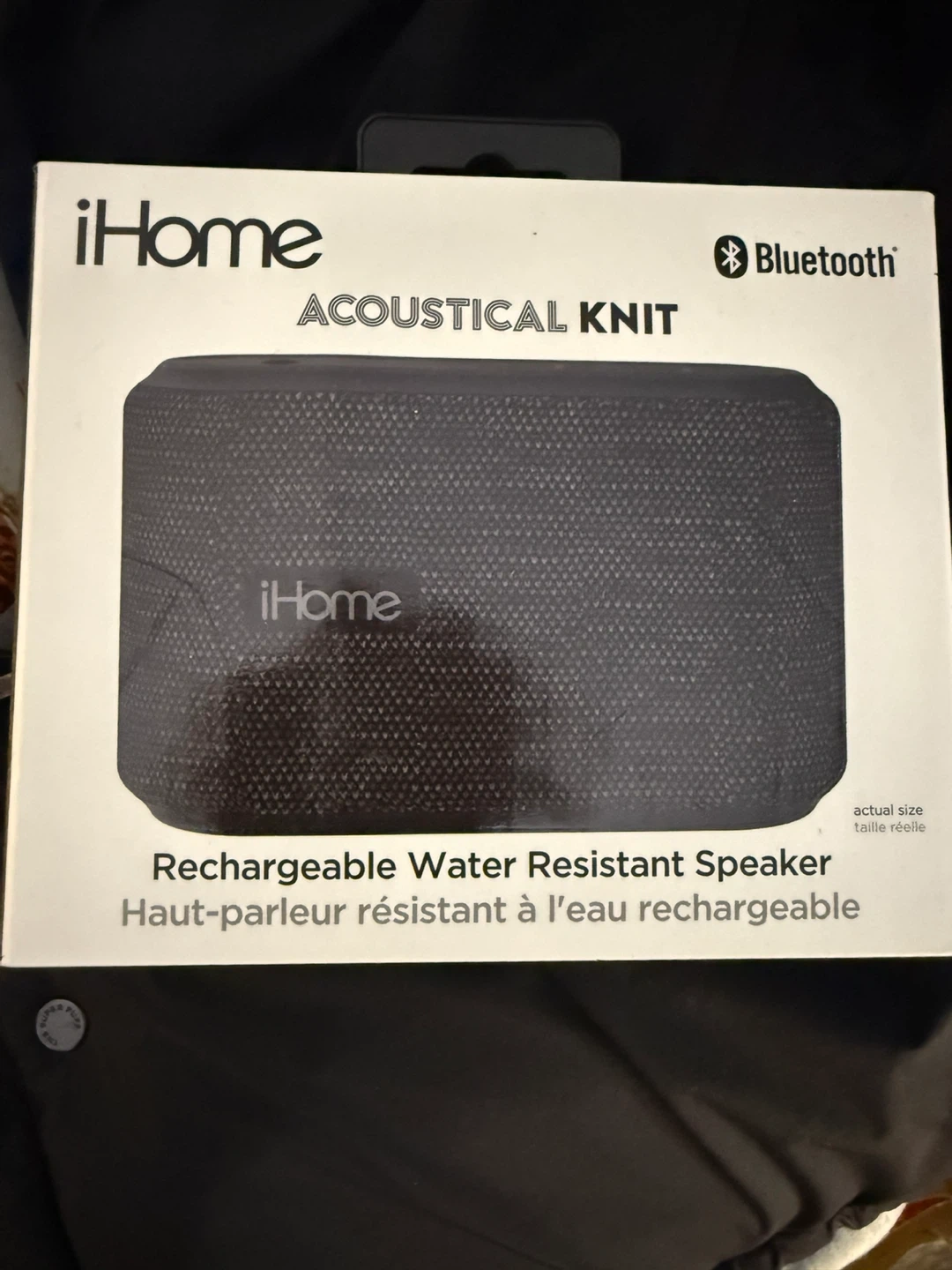 60Selling a brand new iHome Acoustical Knit Rechargeable Water Resistant Speaker! It features Bluetooth connectivity for streaming audio wirelessly, and a rechargeable battery that provides up to 8 hours of playback. Also includes a carry strap for easy portability. The speakerphone has Echo Noise Cancellation for clear calls, and Caller ID announces incoming caller names for iOS 10. It's IP65 certified, making it splashproof and sandproof. Box included!