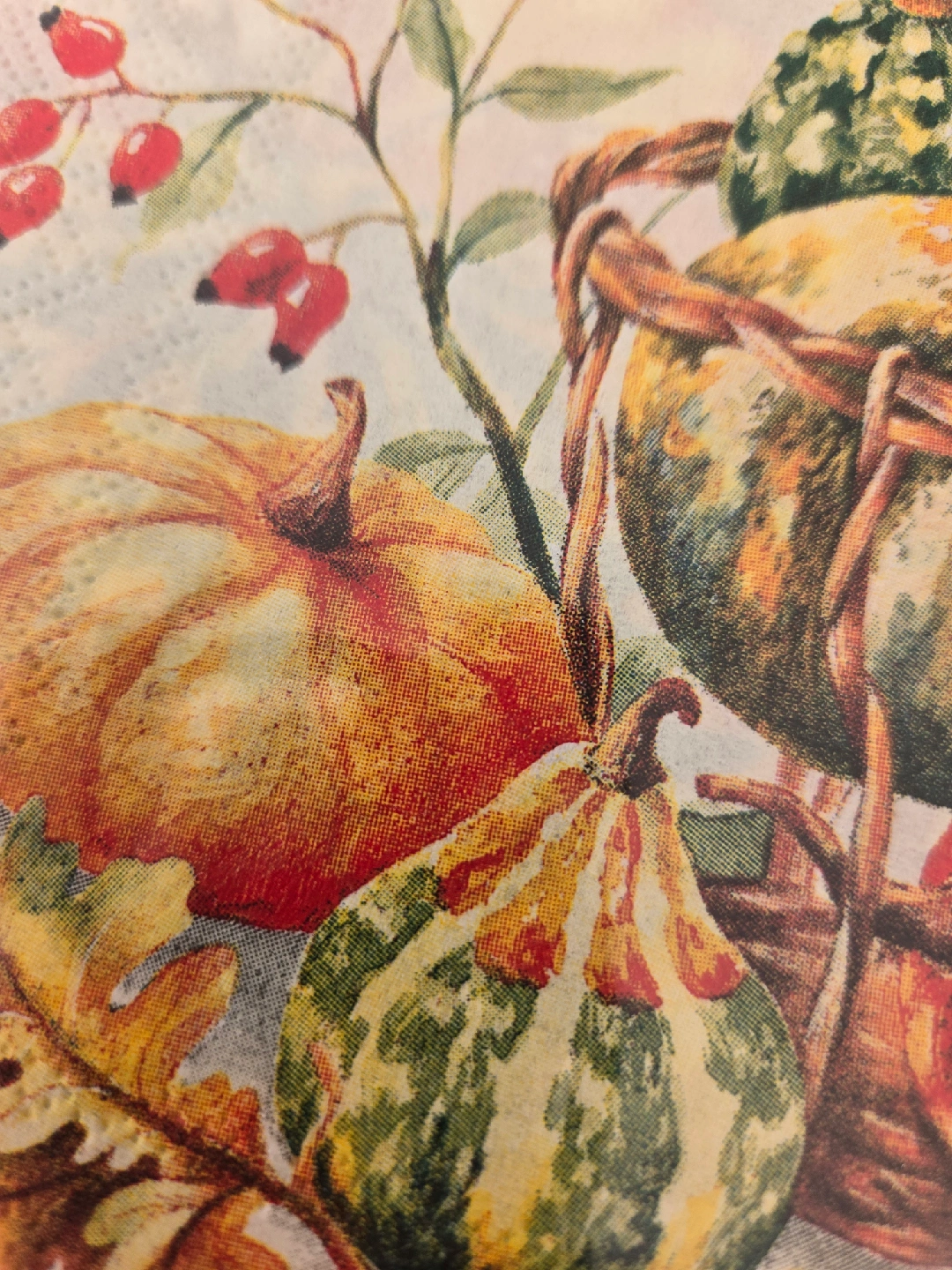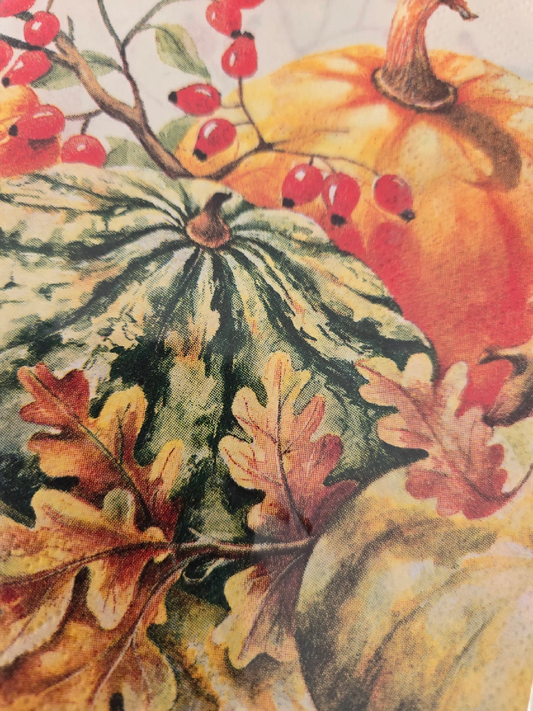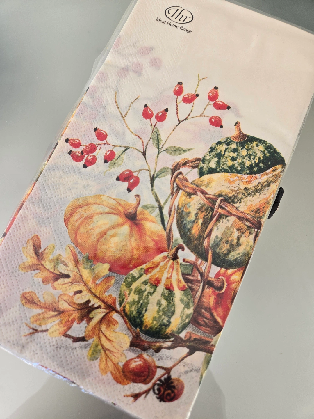 These are IHR Ideal Home Range paper napkins, perfect for autumn or Thanksgiving gatherings! The design features pumpkins, gourds, berries, and autumn leaves. They are still sealed in the original packaging.