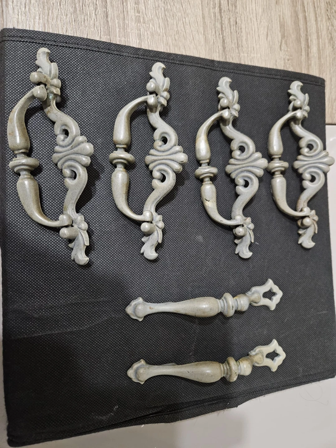 Selling a set of six drawer pulls in a vintage style. They have a lovely ornate design and would be perfect for adding a touch of character to your furniture. They show some signs of wear, but are in overall good condition!