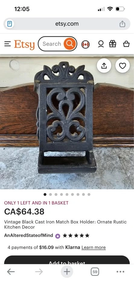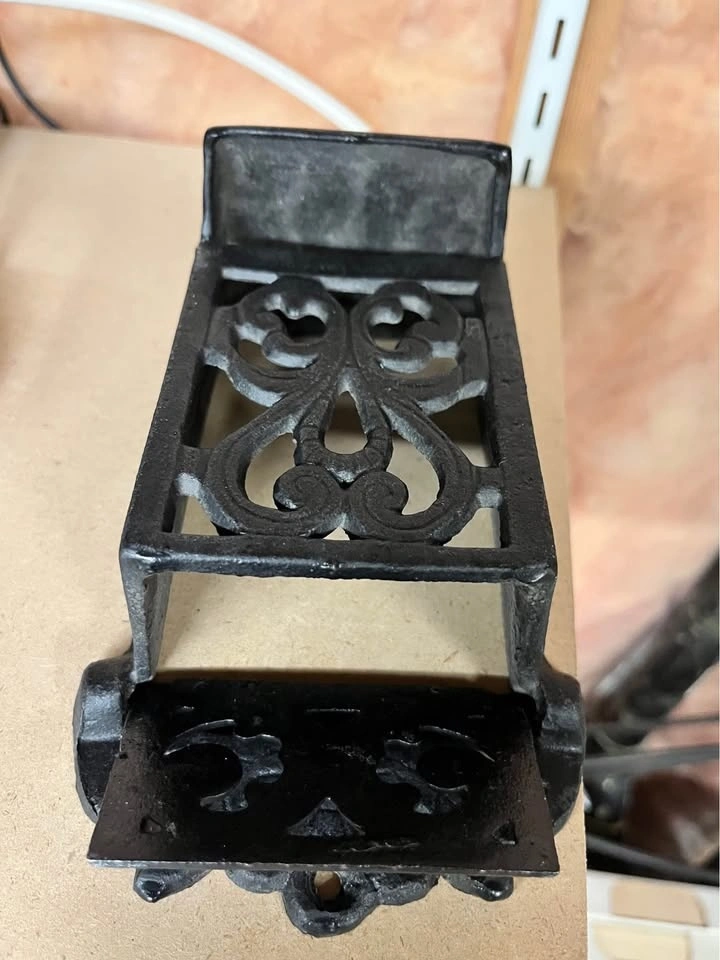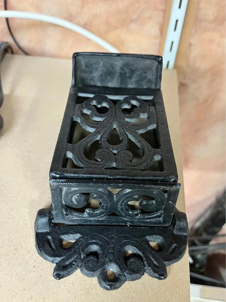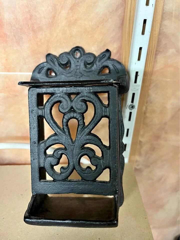 This vintage-style ornate cast iron matchbox holder is designed for wall mounting to securely hold and store matches. Heavy-duty cast iron with an ornate, scrollwork decorative design. Specifically shaped to accommodate a standard matchbox, ideal for placement near fireplaces, stoves, or in kitchens. Measures approximately 7.5 inches in height and 4 inches in width. Features holes for mounting directly to a wall or wood surface. Pick up and cash only.