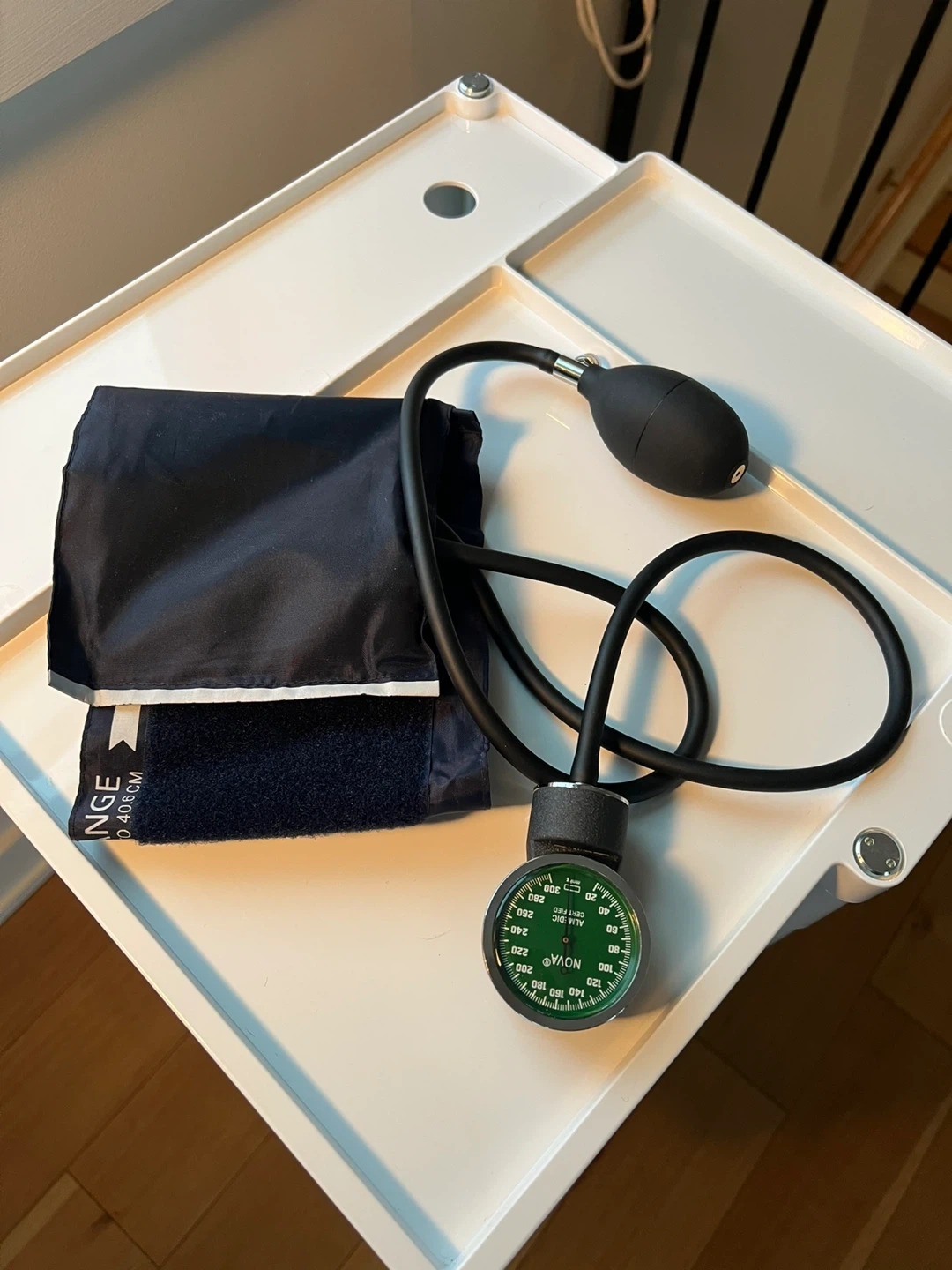 This is a manual inflation Nova Aneroid Sphygmomanometer for blood pressure monitoring. Includes the cuff and bulb.