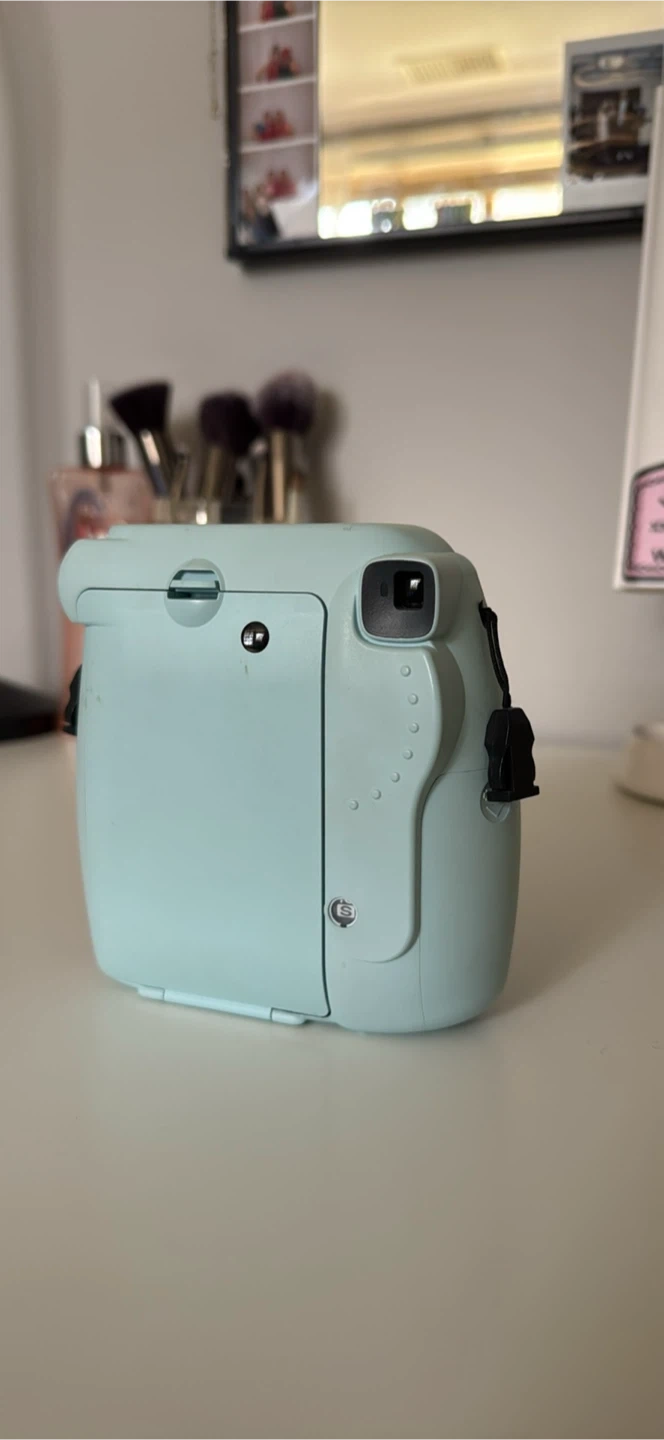 Fujifilm Instax Mini 8 instant camera in a mint colour. It's got a 60mm lens and auto flash. Fun and easy to use for instant memories!