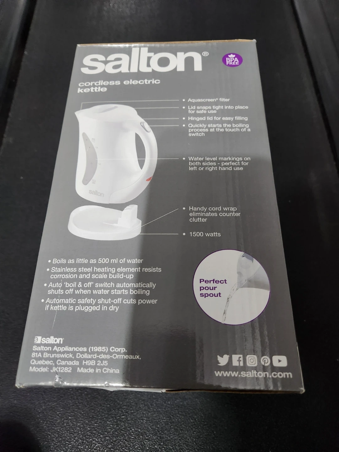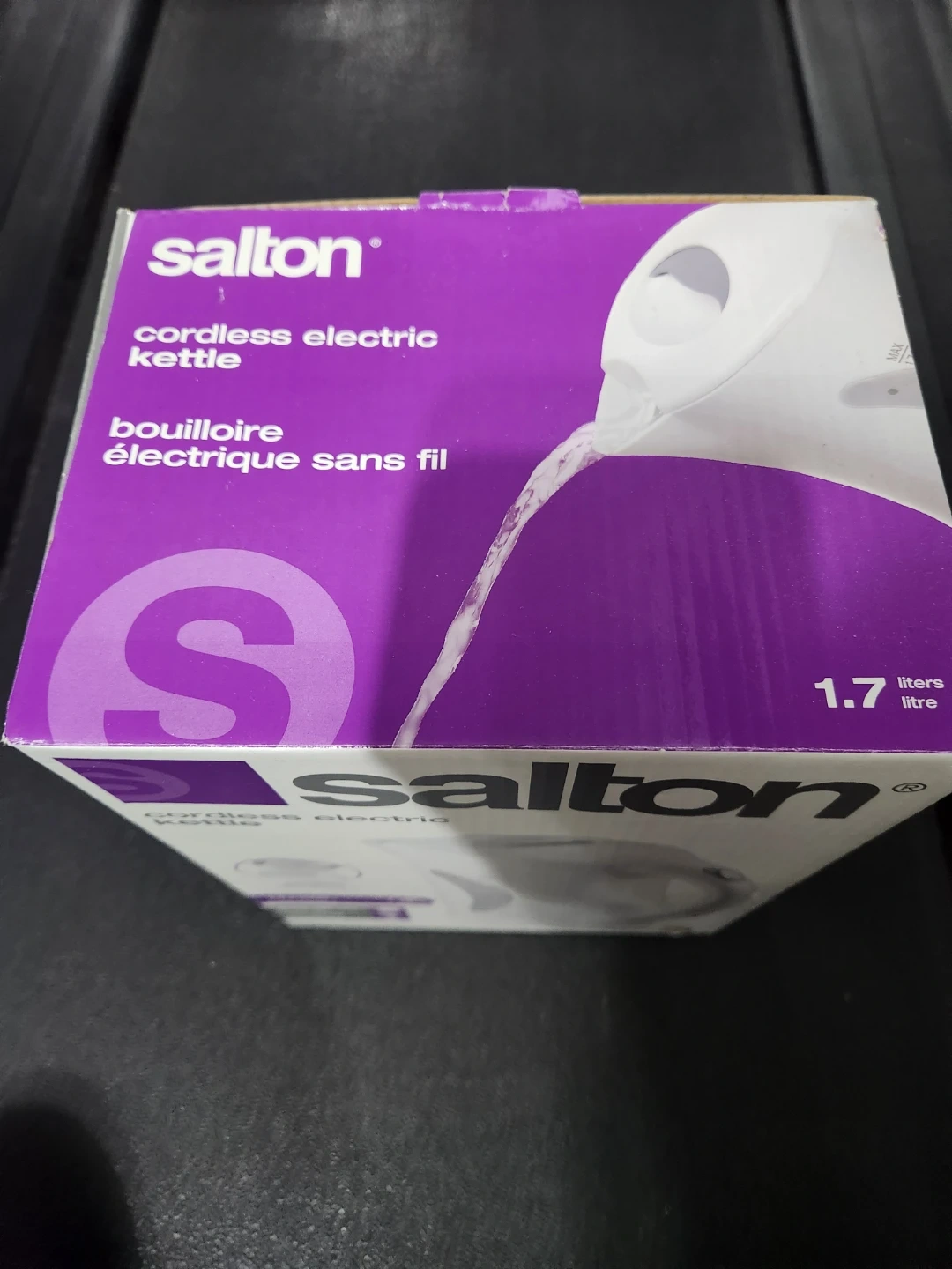 Selling a Salton cordless electric kettle with a 1.7-liter capacity. It features an Aquascreen filter and a hinged lid for easy filling. The kettle has water level markings on both sides and a handy cord wrap to eliminate counter clutter. It boils as little as 500 ml of water and has a stainless steel heating element. Automatic boil & off switch automatically shuts off when water starts boiling. It also has an automatic shut-off that cuts power if the kettle is plugged in dry. Comes with the original box