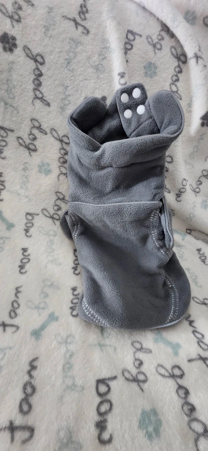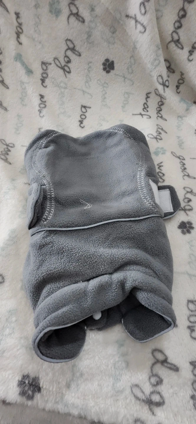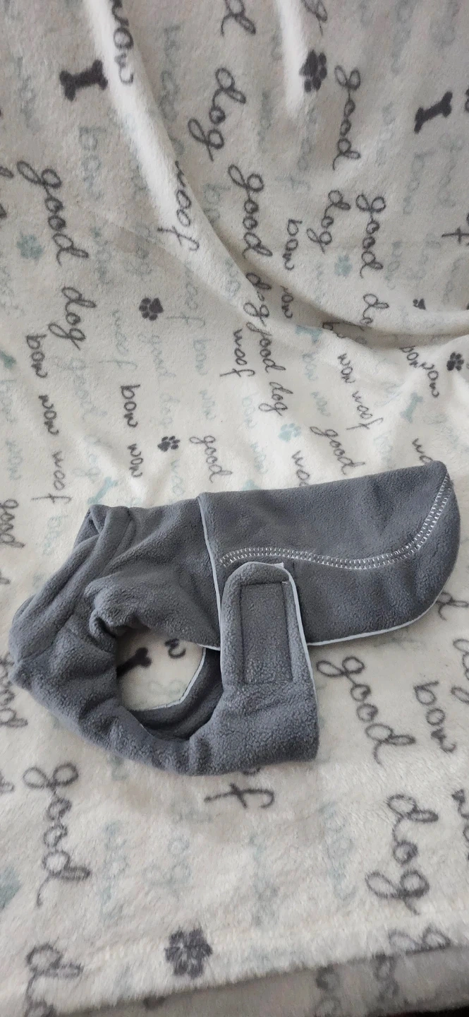 This grey fleece dog coat is designed for warmth and comfort. It features a soft fleece material and easy-to-use hook-and-loop closures. It's perfect for keeping your small dog cozy.