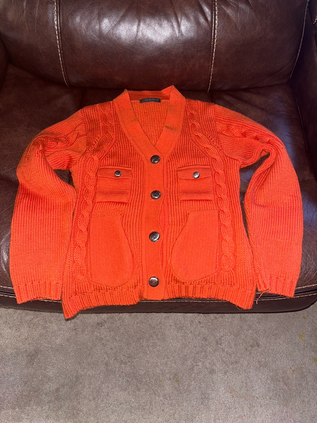 This is a bright orange, long-sleeved cardigan with cable knit detail. It has a V-neck and four button closures. It features two large patch pockets.