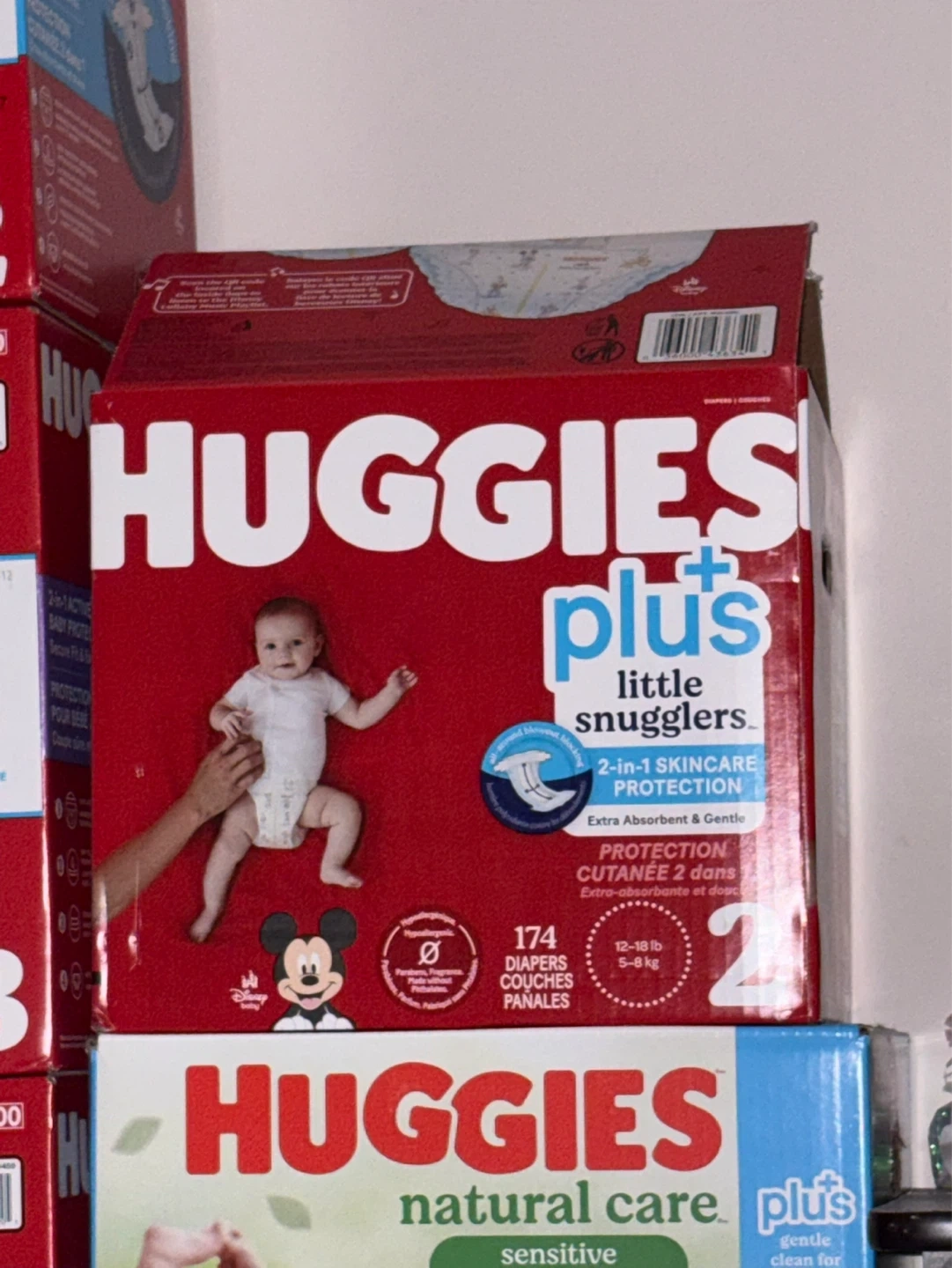 This box contains 174 Huggies Little Snugglers diapers. They're size 2 and suitable for babies 12-18 lbs (5-8 kg). These diapers offer 2-in-1 skincare protection and are extra absorbent and gentle. Its brand new . box is unopened. Price is slightly negotiable