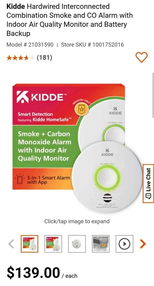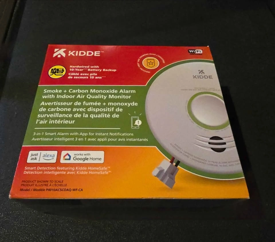 Brand new in box, unopened Kidde hardwired interconnected combination smoke and CO alarm with indoor air quality monitor. Model # 21031590. This is an all-in-one smart home safety device that integrates smoke and carbon monoxide (CO) detection with Indoor Air Quality (IAQ) monitoring. It detects multiple airborne threats from a single, Wi-Fi-enabled device. Connects to the Kidde app for status updates and mobile alerts. Designed to work with existing Kidde hardwired interconnected alarms for whole-home alarm activation – when one alarm sounds, they all sound, and you get an alert on your phone. The built-in air quality sensor measures temperature, relative humidity, and Total Volatile Organic Compounds. Use the Kidde app to receive notifications if hazards are detected, know when the device needs replacement, and test alarms. Powered by 120V AC with a sealed 10-year lithium backup battery. No additional hub is needed; just scan the QR code on the back. Compatible with Google Assistant and Amazon Alexa. Pickup in Mississauga.