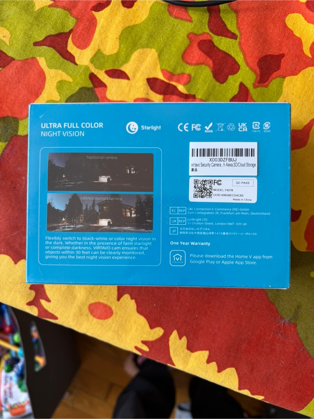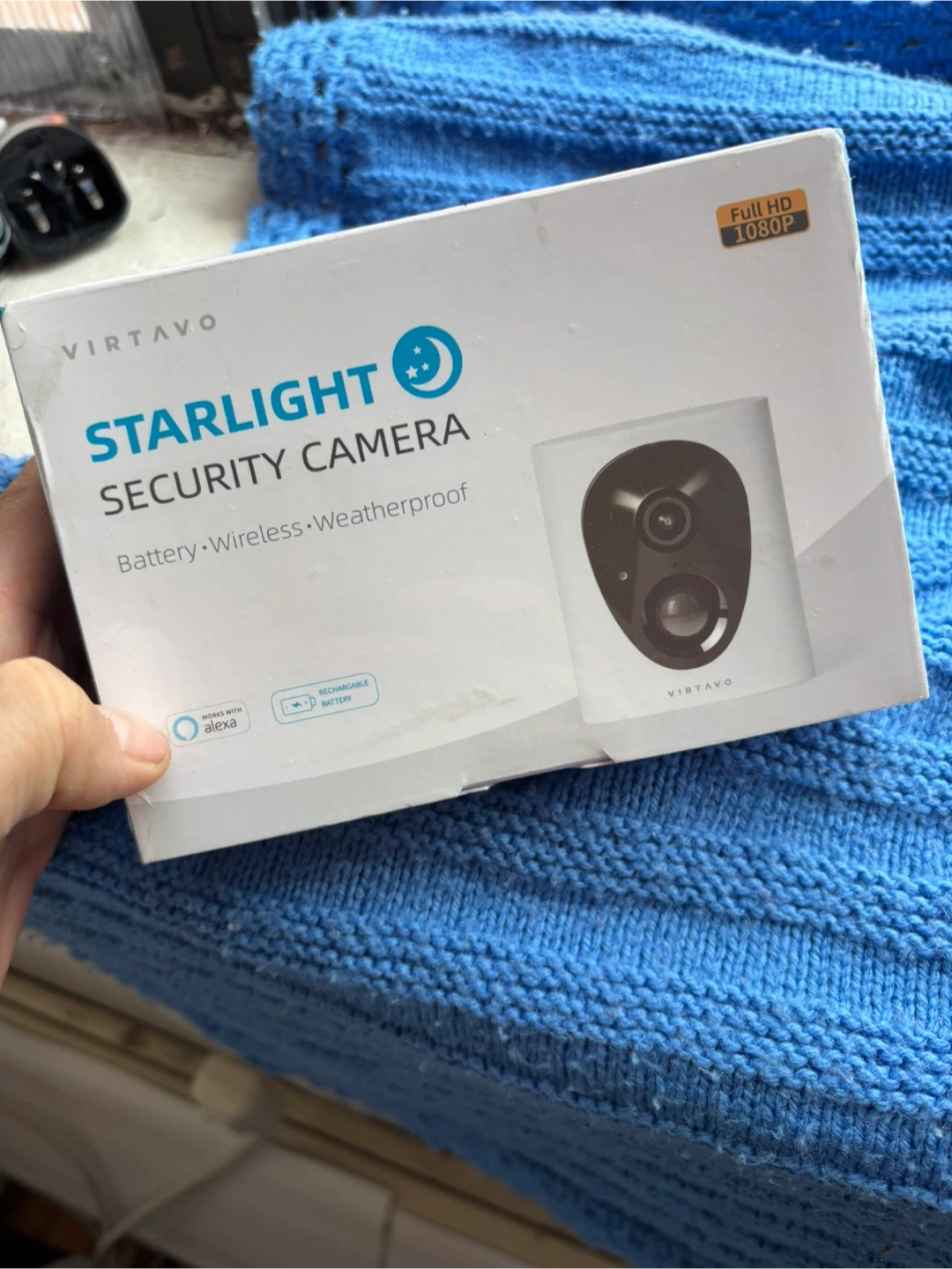Selling a brand new VIRTAVO Starlight Security Camera, still in its original packaging! This camera features ultra full color night vision and is designed to be battery-powered, wireless, and weatherproof. It also works with Alexa. The box also mentions a 1-month cloud plan free trial, smart AI detection, custom activity zone, rich notifications, and encrypted cloud storage