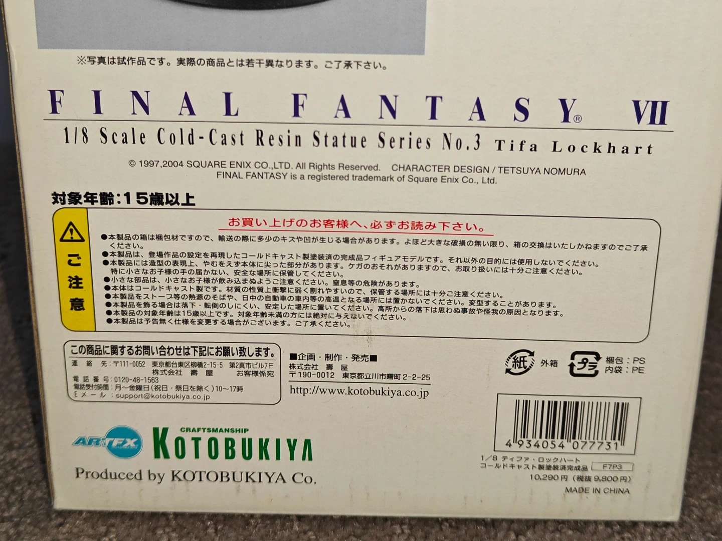 I am selling a Final Fantasy VII - No. 3 Tifa Lockhart 1/8 Scale Cold-Cast Resin Statue Series Action Figures FF 7 in like-new condition. Mainly sat in the box. Produced by Kotobukiya Company / 2004 Square ENIX Co. Purchased in Japan. This authentic and officially licensed figure was produced in collaboration with Square Enix Co. in 2004, making it a highly sought-after collectible for any dedicated Final Fantasy enthusiast.