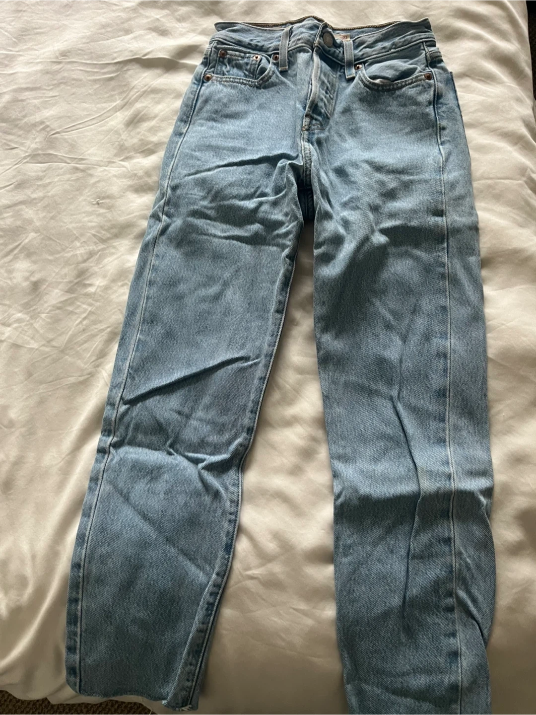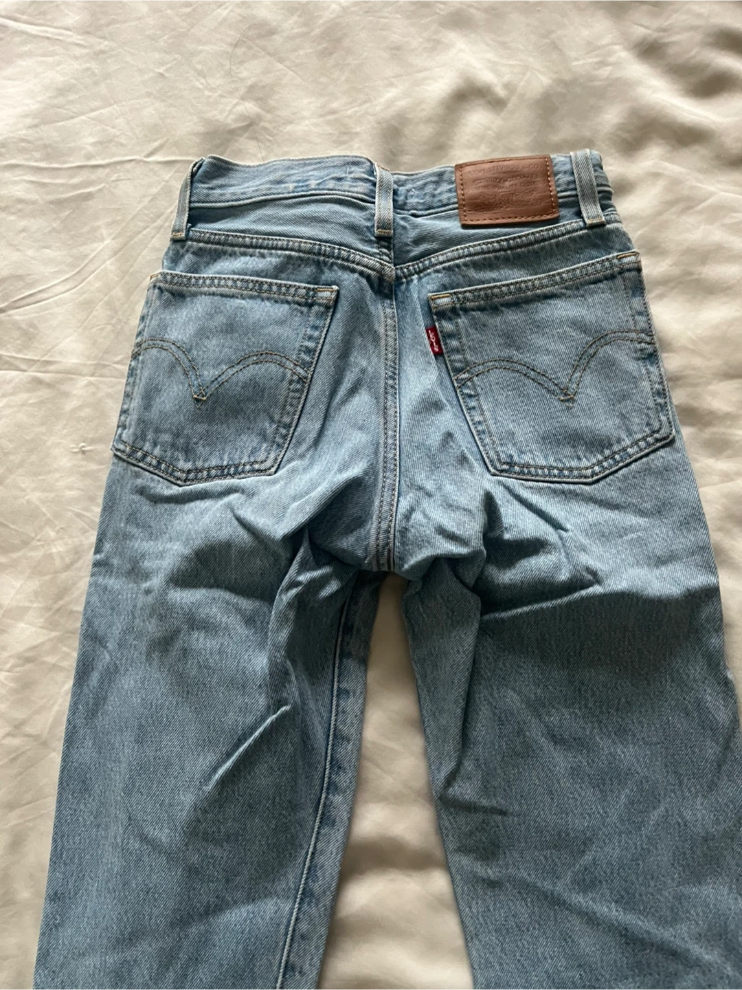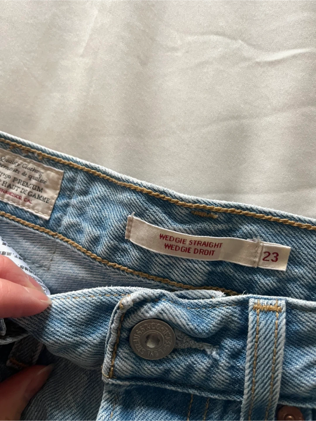 Worn a few times then gained weight. Levi's Wedgie Straight jeans in a light wash blue. These jeans are size 23. They're made from durable denim.