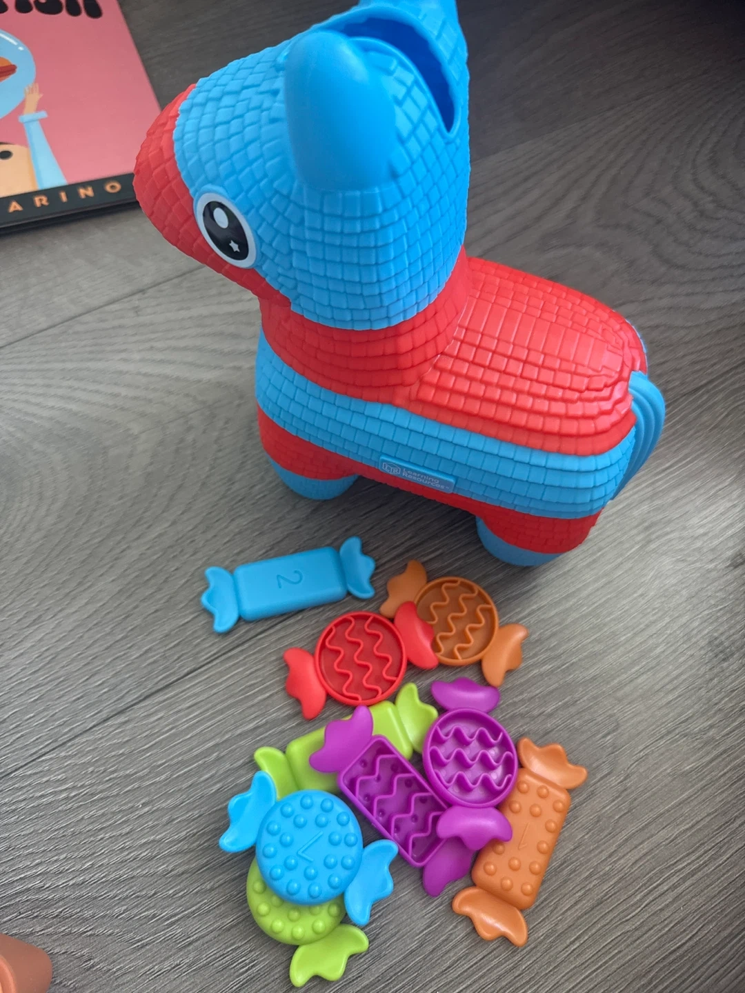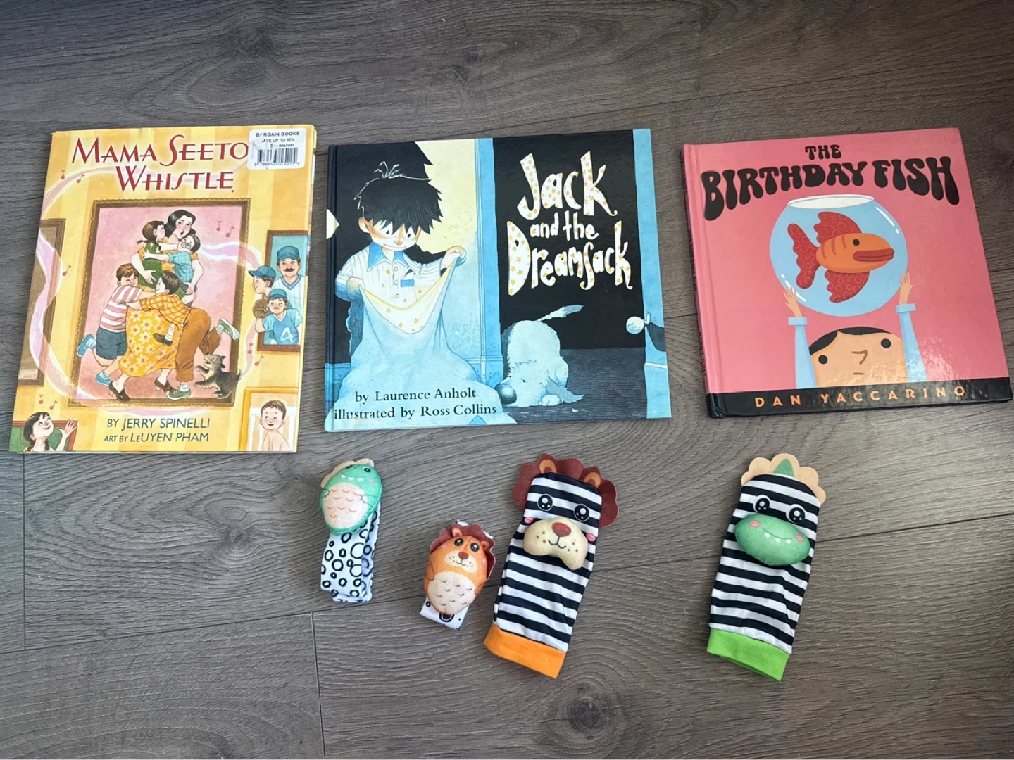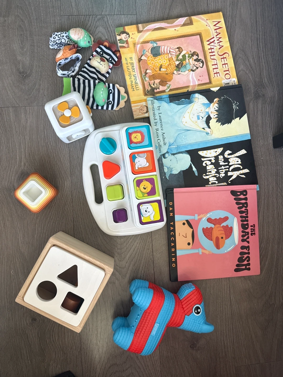 and 'The Birthday Fish'. Toys are made of plastic and wood.