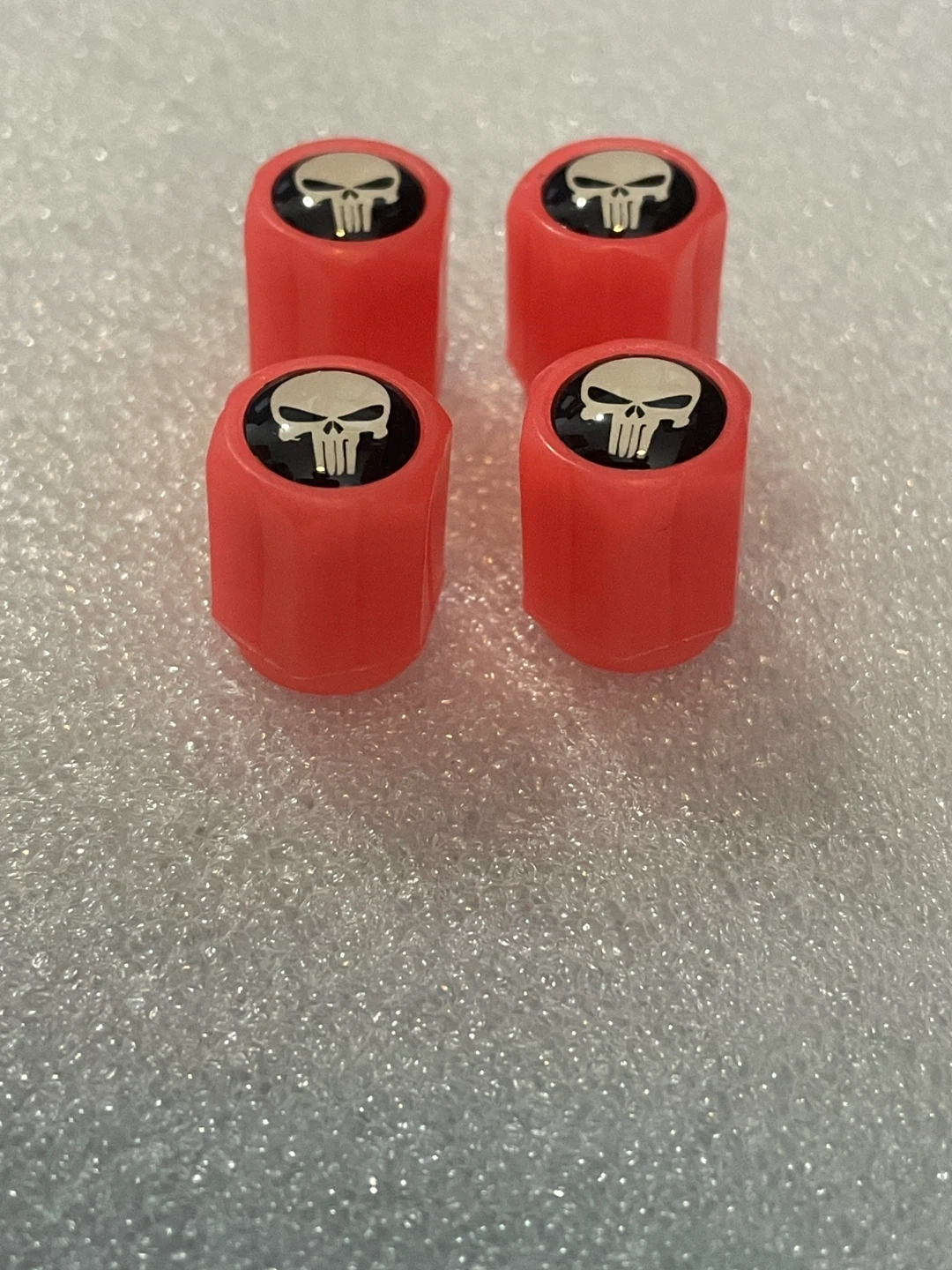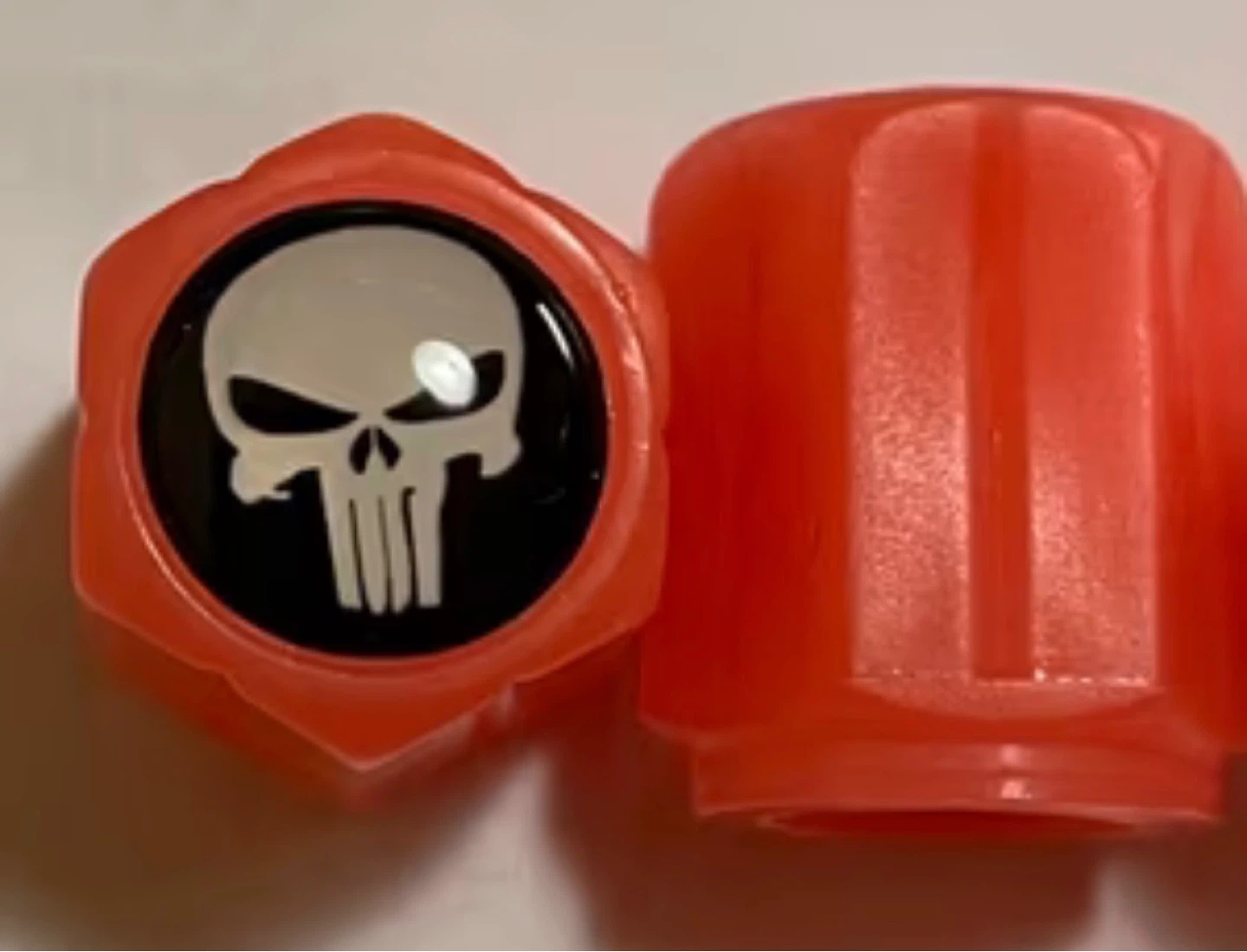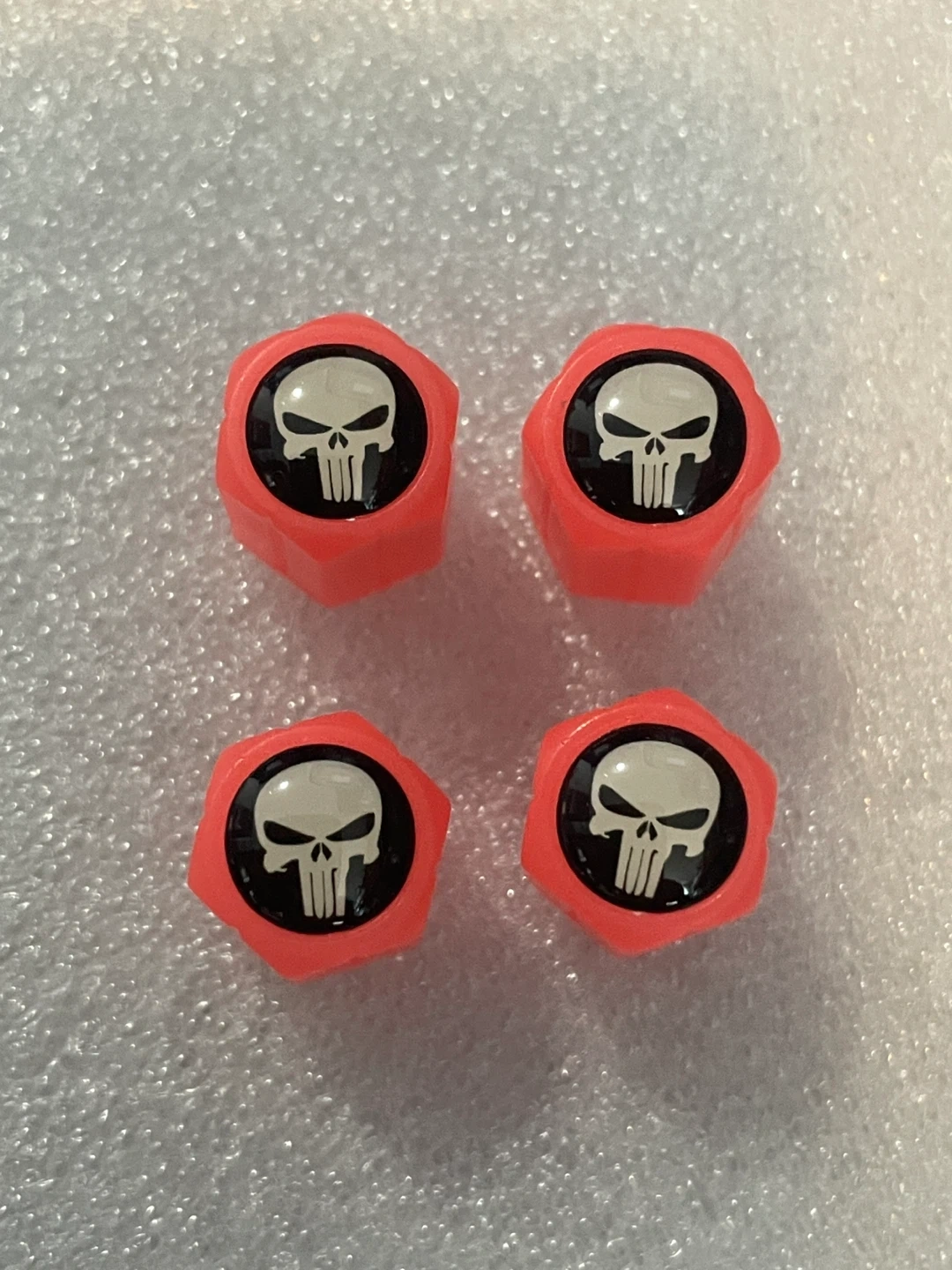 Set of four bright orange valve caps featuring the iconic Punisher skull emblem. These caps help protect your tire valves from dirt and debris.