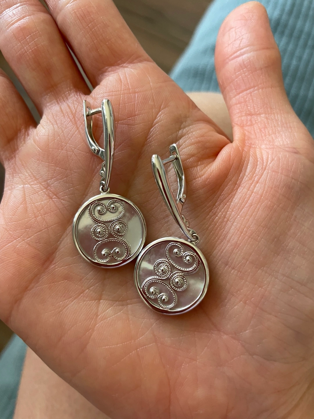 Beautiful pair of dangle earrings. Silver tone metal. Features a circular mother of pearl inlay. Intricate swirl detailing. Secure leverback closure.