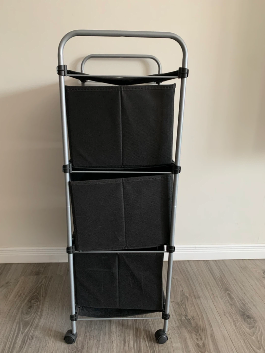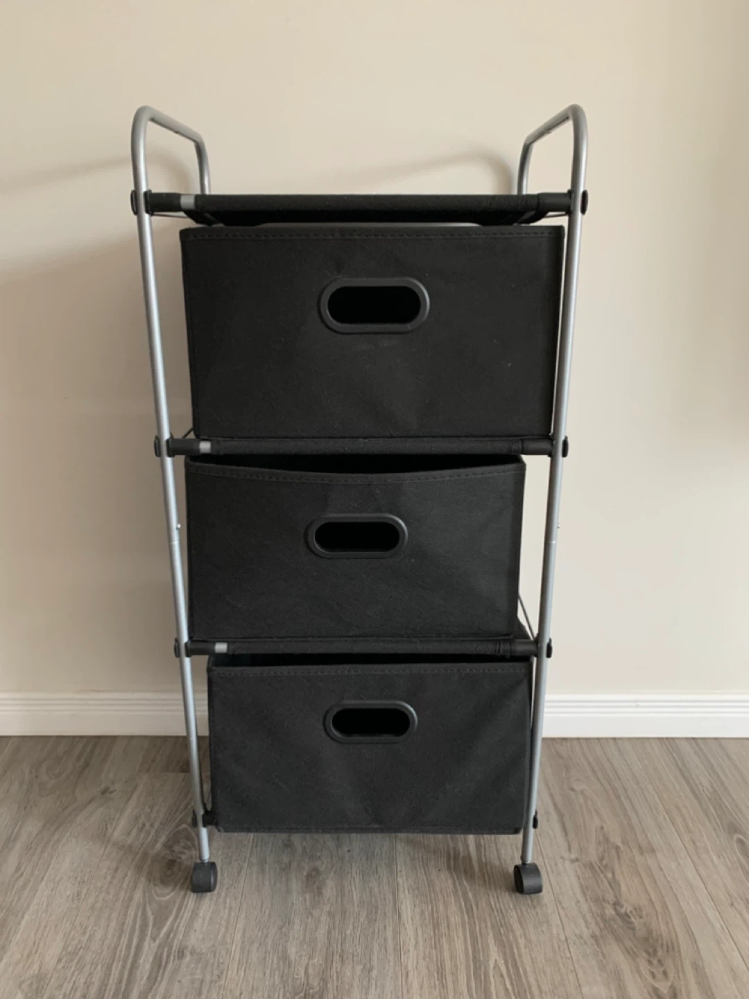 This 3-drawer storage cart is black and comes with wheels for easy transport. It's made with a metal frame and fabric drawers. It's useful for organizing clothes, toys, or other household items.