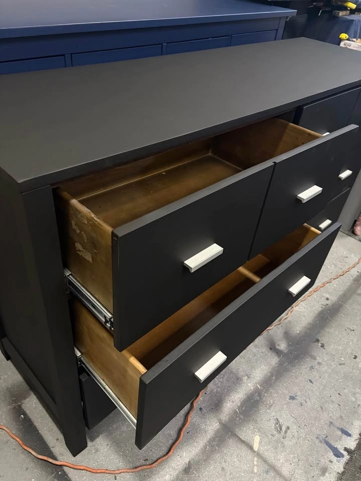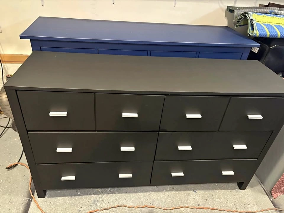 Beautiful Black Dresser with silver knobs made from solid wood. Refinished in a flat black with silver handles. Timeless style with generous storage. Good, solid, sturdy, and well finished. Drawers open and close smoothly. Solid wood construction, coated in 2 coats of polyurethane, refinished in durable furniture paint. Multiple spacious drawers. Approx. standard double dresser size (34.5” H x 60” W 18” D). Cash or etransfer accepted. Pickup: North Delta. Let me know if you're interested!