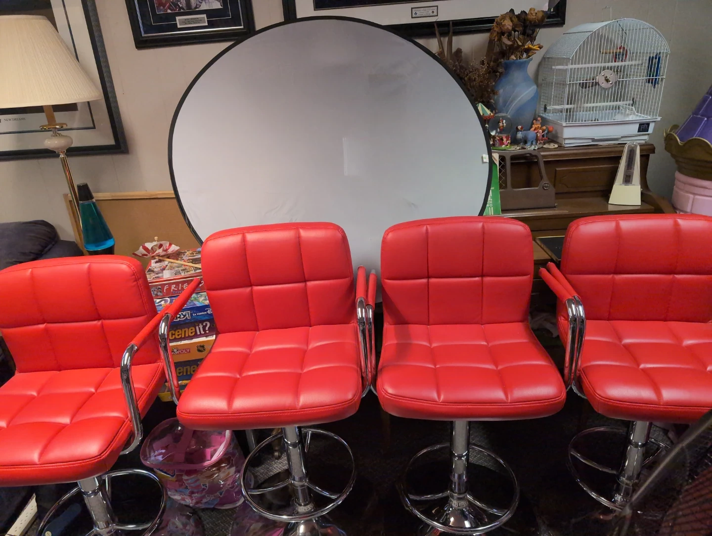 Selling a set of four vibrant red swivel bar stools! These chairs feature a modern design with a quilted seat and backrest, complemented by chrome-finished bases and armrests. They'd be a great addition to any kitchen or bar area!