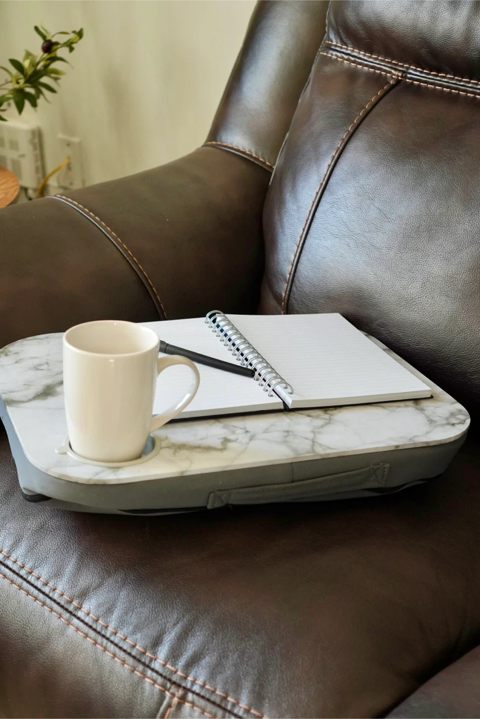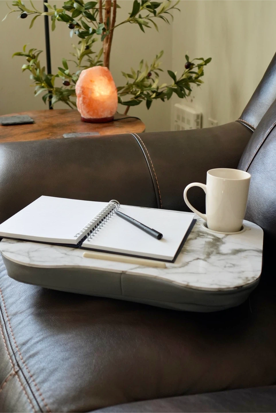 Selling a LapGear lap desk with a stylish marble pattern top. It's perfect for working or relaxing on the couch or in bed. It has a built-in cup holder and a comfortable cushion base.