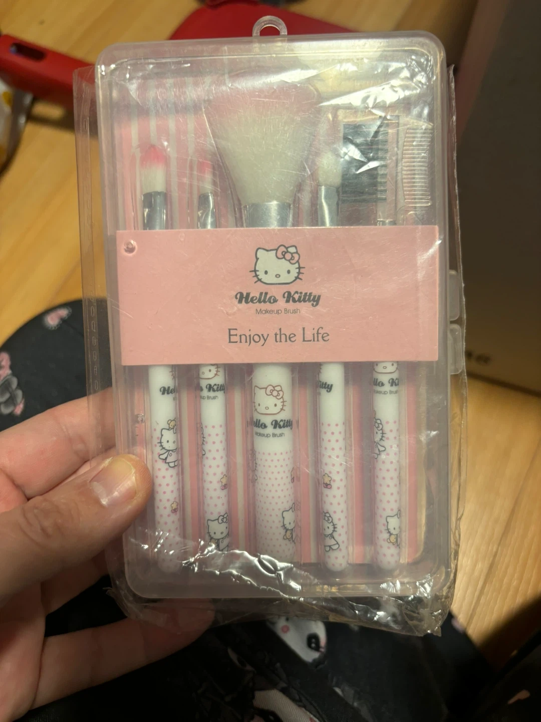 This is a set of Hello Kitty makeup brushes. The handles are decorated with pink polka dots and Hello Kitty graphics. It includes a variety of brushes for different makeup applications. Open to offers