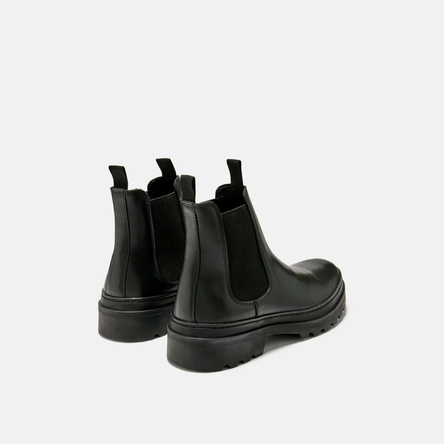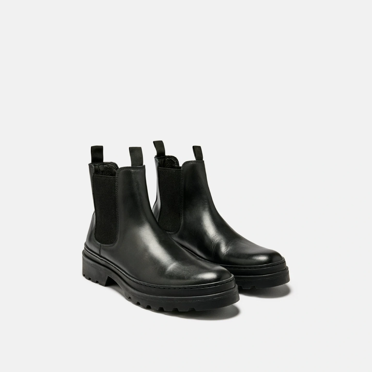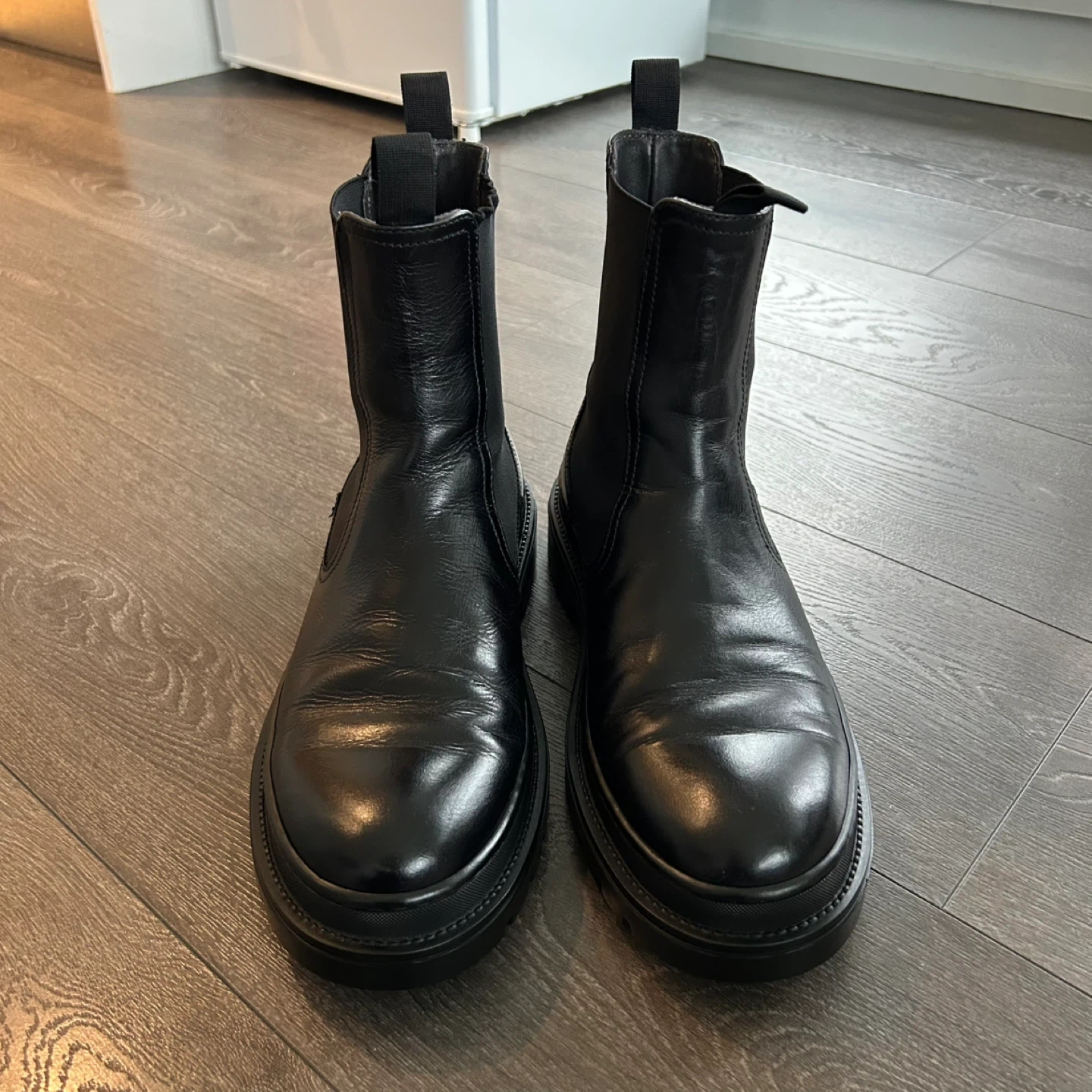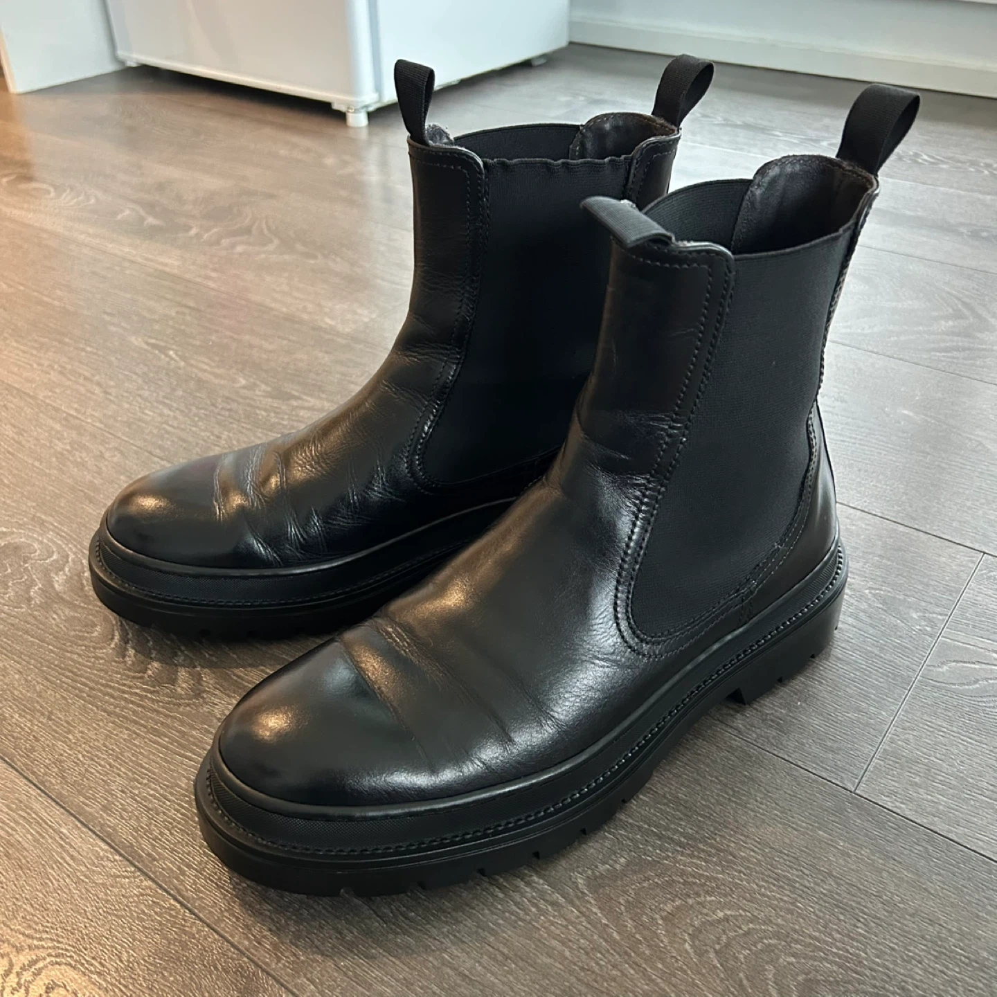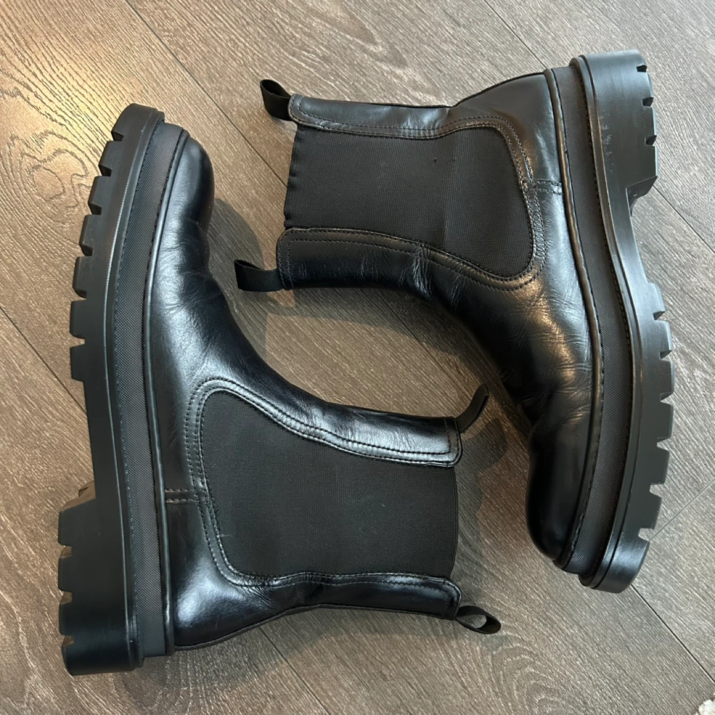 Classic black leather Chelsea boots from the brand MINELLI Paris. Features elastic side panels and a chunky lug sole. These boots are made of leather with a rubber sole.