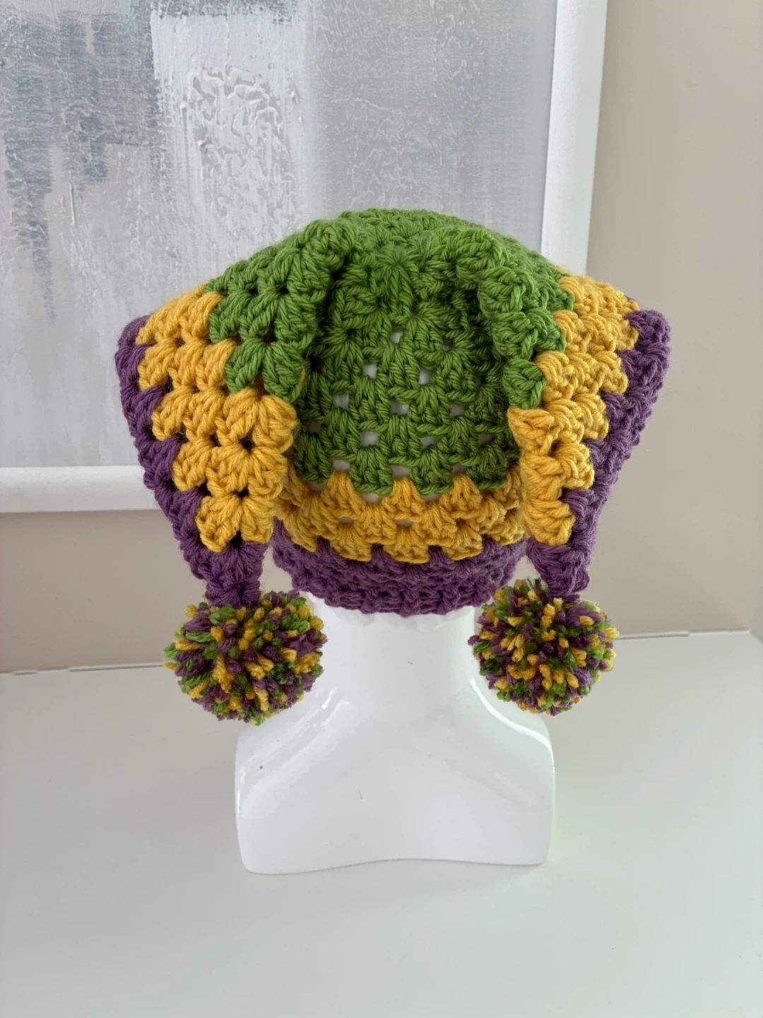 This is a handmade crochet jester hat in Mardi Gras colours. It features two matching pom poms on the sides. It's a cozy and stylish accessory!