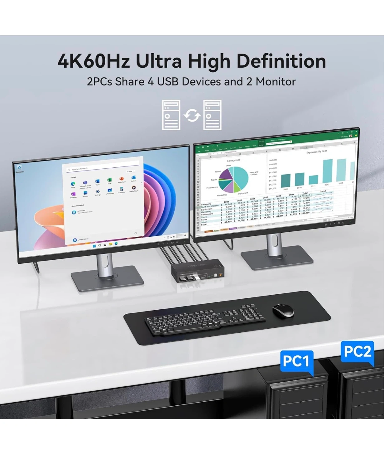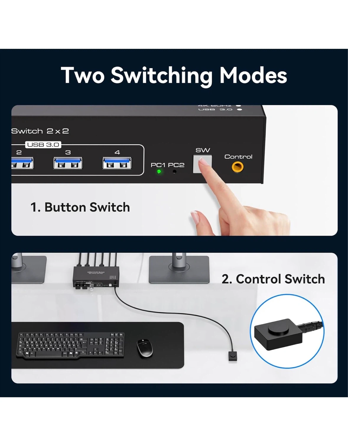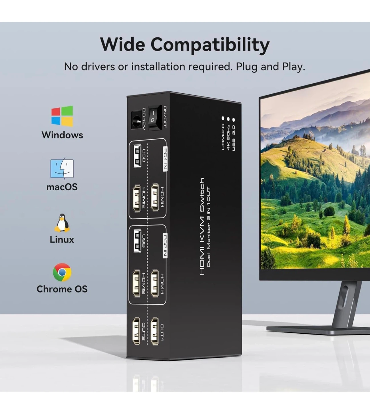HDMI KVM Switch Dual Monitor 2 Computers KVM Switch 4K@60Hz HD2