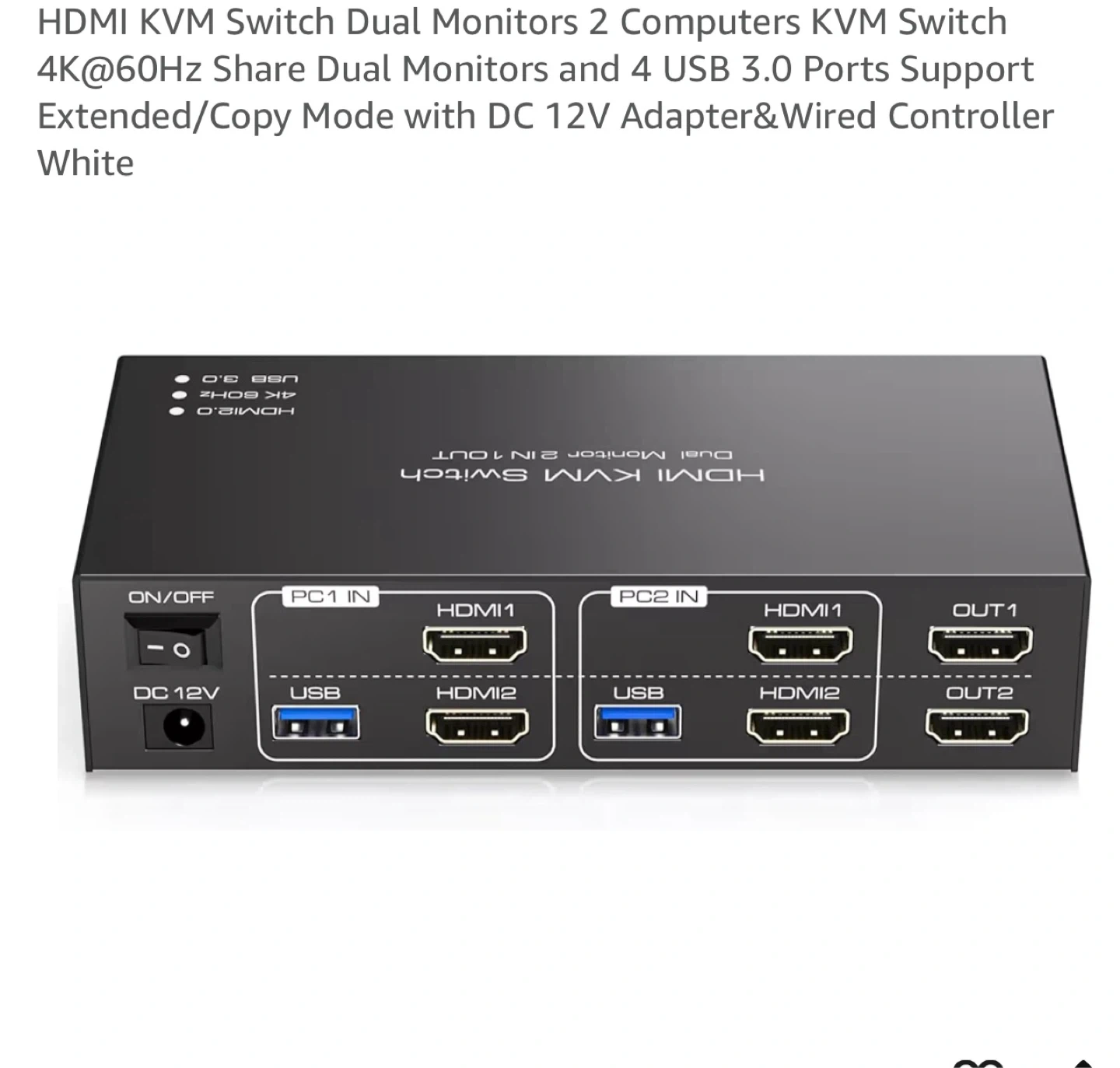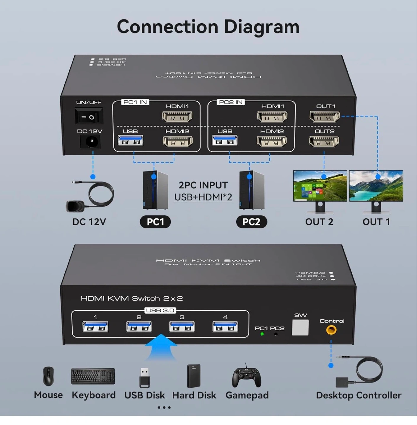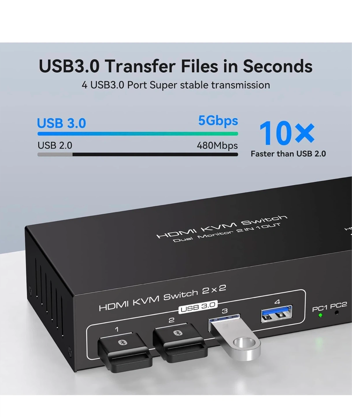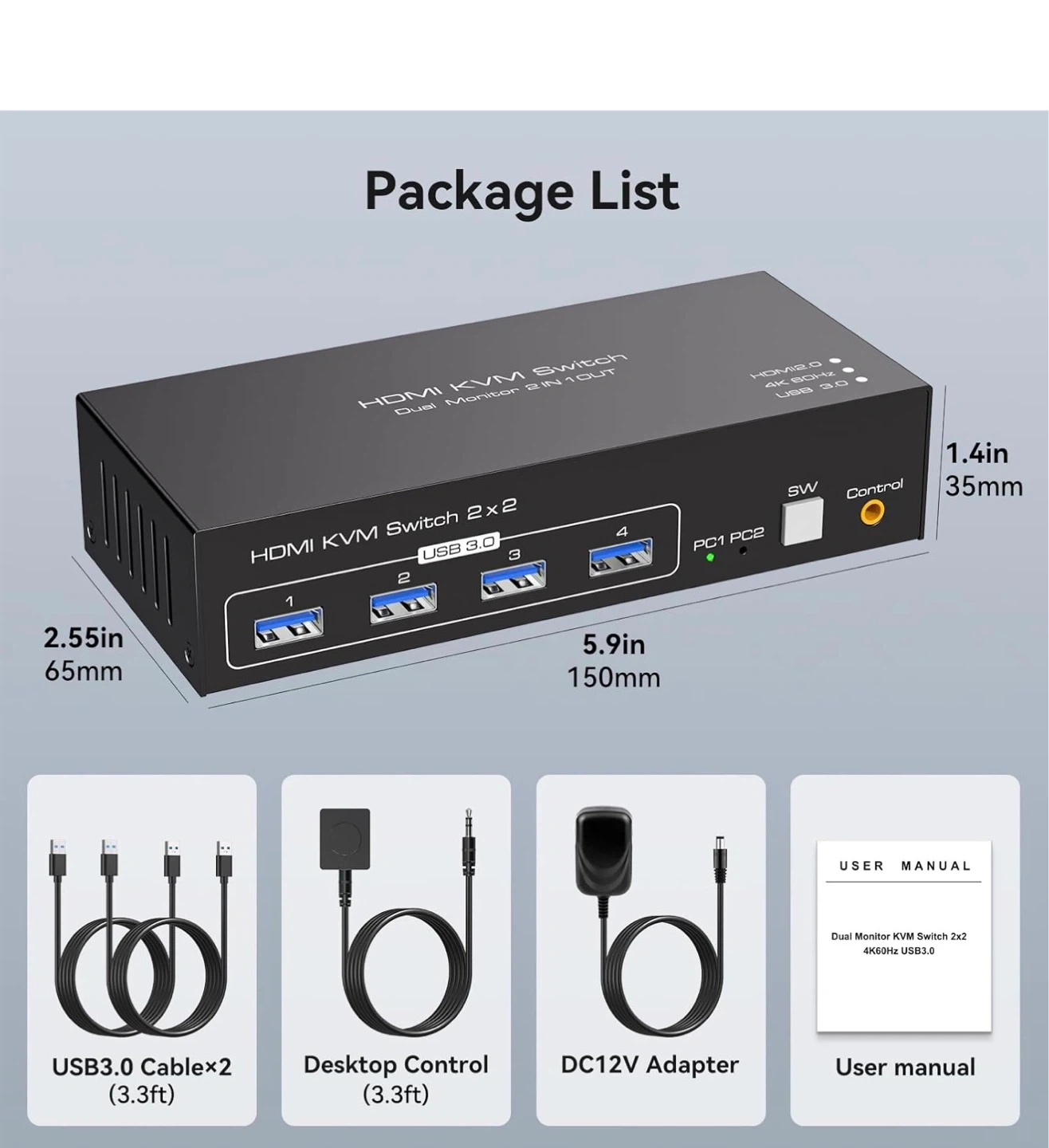 HDMI KVM Switch Dual Monitor 2 Computers KVM Switch 4K@60Hz HD2