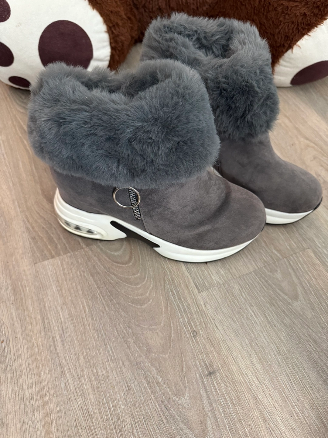 Grey ankle boots with plush faux fur lining for warmth. These boots feature a side zipper for easy on and off. The soles have a chunky white and black design with air cushioning for comfort. They're a stylish choice for colder weather! Size is a small 43. Real size is 41