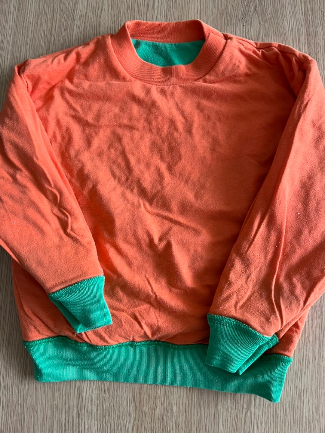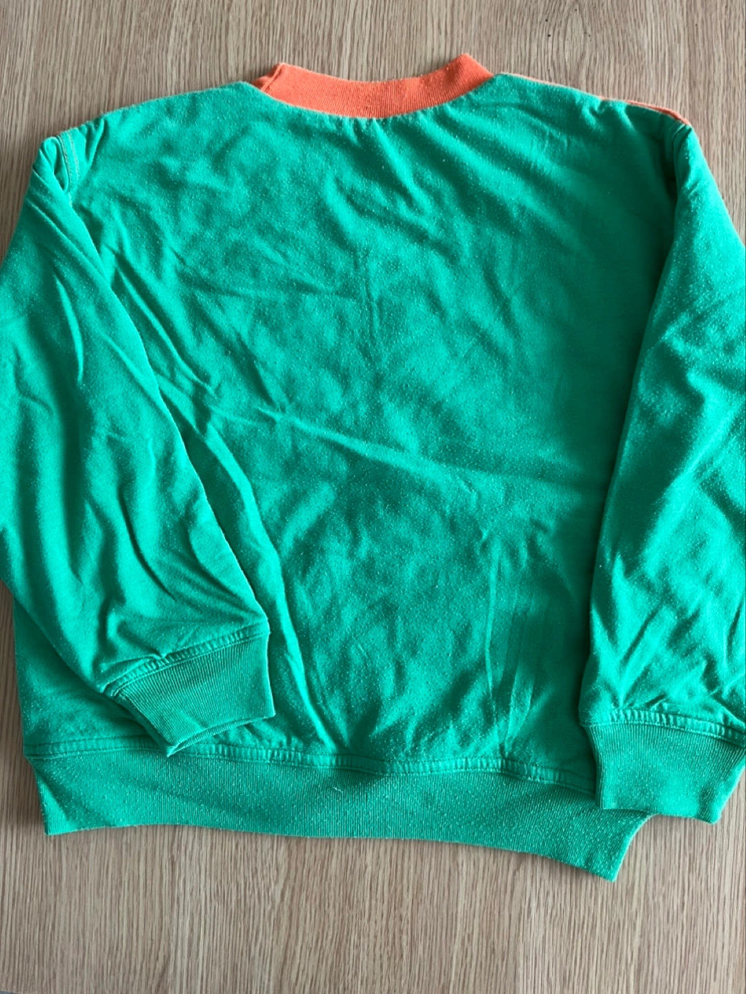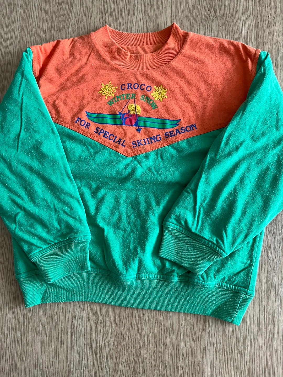 Reversible green and orange long-sleeved sweatshirt. Features a ski-themed design and an embroidered snowflake. The reversed side is orange with green cuff and hem. In very good condition. Detailed measurements on request. If ad is up, the item is available.