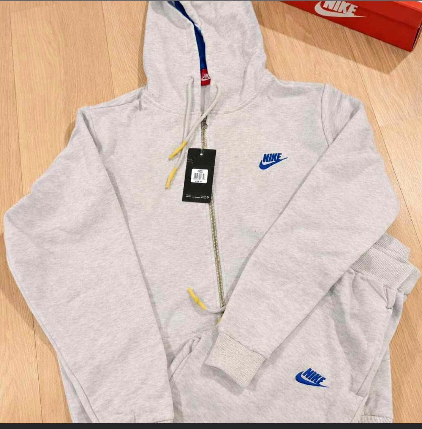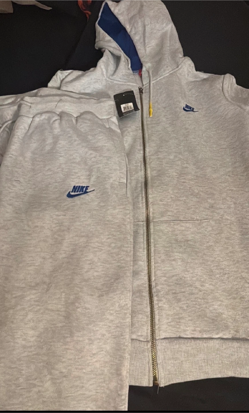 This is a Nike full zip hoodie and jogger set. It's a light grey color with blue Nike logos. The set includes a hooded zip-up jacket and matching sweatpants. Material is soft fleece, perfect for casual wear.