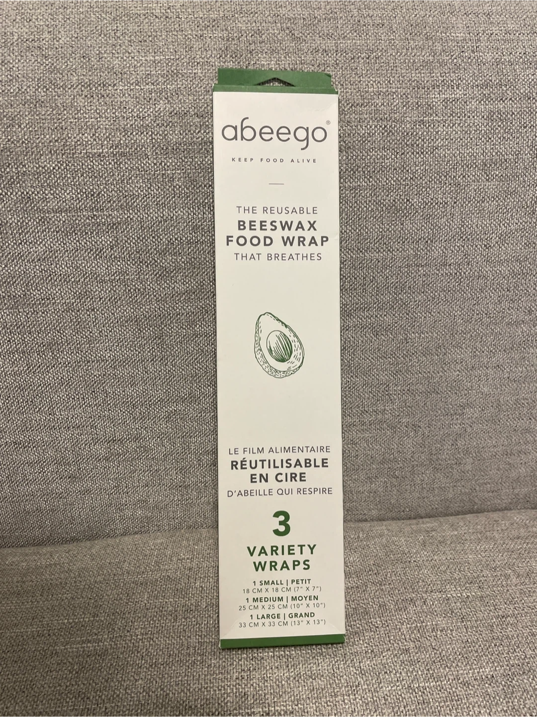 This Abeego variety pack includes three reusable beeswax food wraps. It comes with one small (18 cm x 18 cm), one medium (25 cm x 25 cm), and one large (33 cm x 33 cm) wrap.